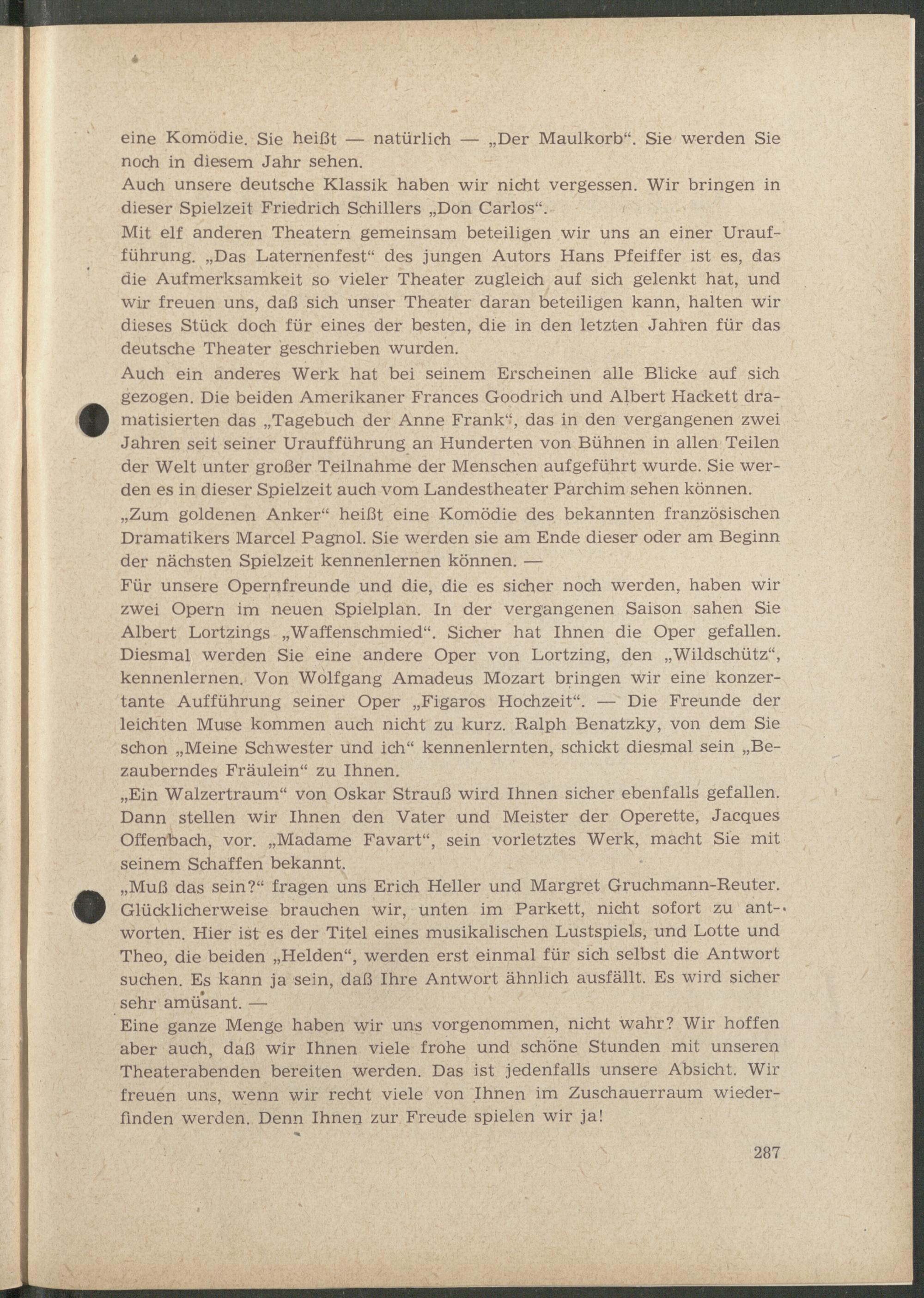 Auch ein anderes Werk hat bei seinem Erscheinen alle Blicke auf sich gezogen. Die beiden Amerikaner Frances Goodrich und Albert Hackett dramatisierten das „Tagebuch der Anne Frank“, das in den vergangenen zwei Jahren seit seiner Uraufführung an Hunderten von Bühnen in allen Teilen der Welt unter großer Teilnahme der Menschen aufgeführt wurde. Sie werden es in dieser Spielzeit auch vom Landestheater Parchim sehen können. „Zum goldenen Anker“ heißt eine Komödie des bekannten französischen Dramatikers Marcel Pagnol. Sie werden sie am Ende dieser oder am Beginn der nächsten Spielzeit kennenlernen können. —