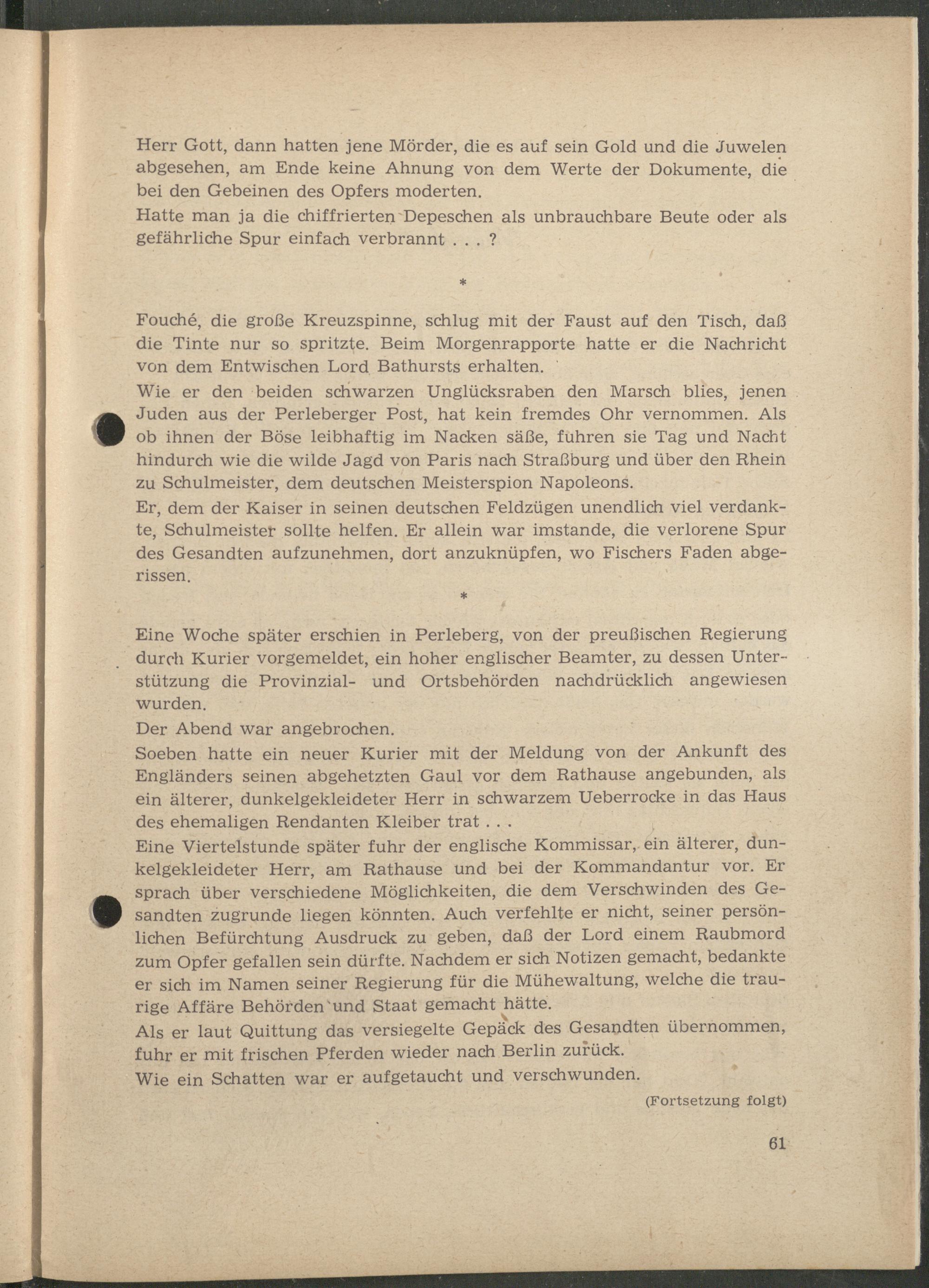 Wie er den beiden schwarzen Unglücksraben den Marsch blies, jenen Juden aus der Perleberger Post, hat kein fremdes Ohr vernommen. Als ob ihnen der Böse leibhaftig im Nacken säße, fuhren sie Tag und Nacht hindurch wie die wilde Jagd von Paris nach Straßburg und über den Rhein zu Schulmeister, dem deutschen Meisterspion Napoleons.