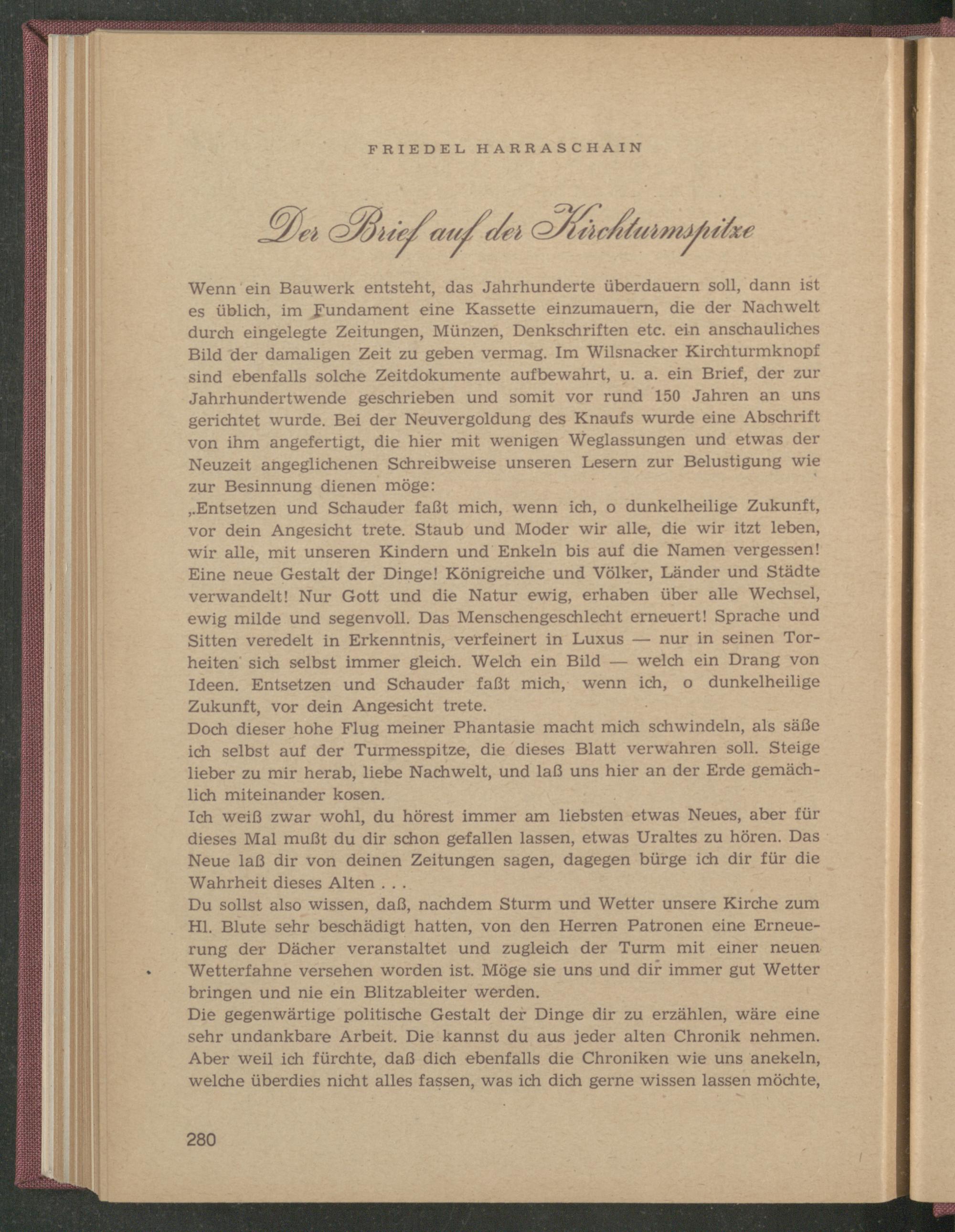 Du sollst also wissen, daß, nachdem Sturm und Wetter unsere Kirche zum Hl. Blute sehr beschädigt hatten, von den Herren Patronen eine Erneuerung der Dächer veranstaltet und zugleich der Turm mit einer neuen Wetterfahne versehen worden ist. Möge sie uns und dir immer gut Wetter bringen und nie ein Blitzableiter werden.