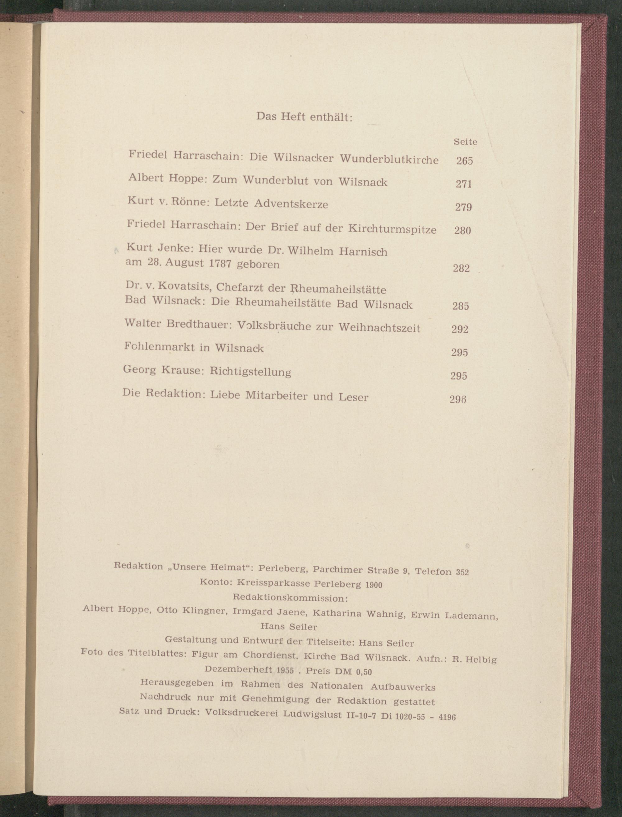 Gestaltung und Entwurf der Titelseite: Hans Seiler Foto des Titelblattes: Figur am Chordienst. Kirche Bad Wilsnack. Aufn.: R. Helbig Dezemberheft 1955 . Preis DM 0,50 Herausgegeben im Rahmen des Nationalen Aufbauwerks Nachdruck nur mit Genehmigung der Redaktion gestattet Satz und Druck: Volksdruckerei Ludwigslust II-10-7 Di 1020-55 - 4196