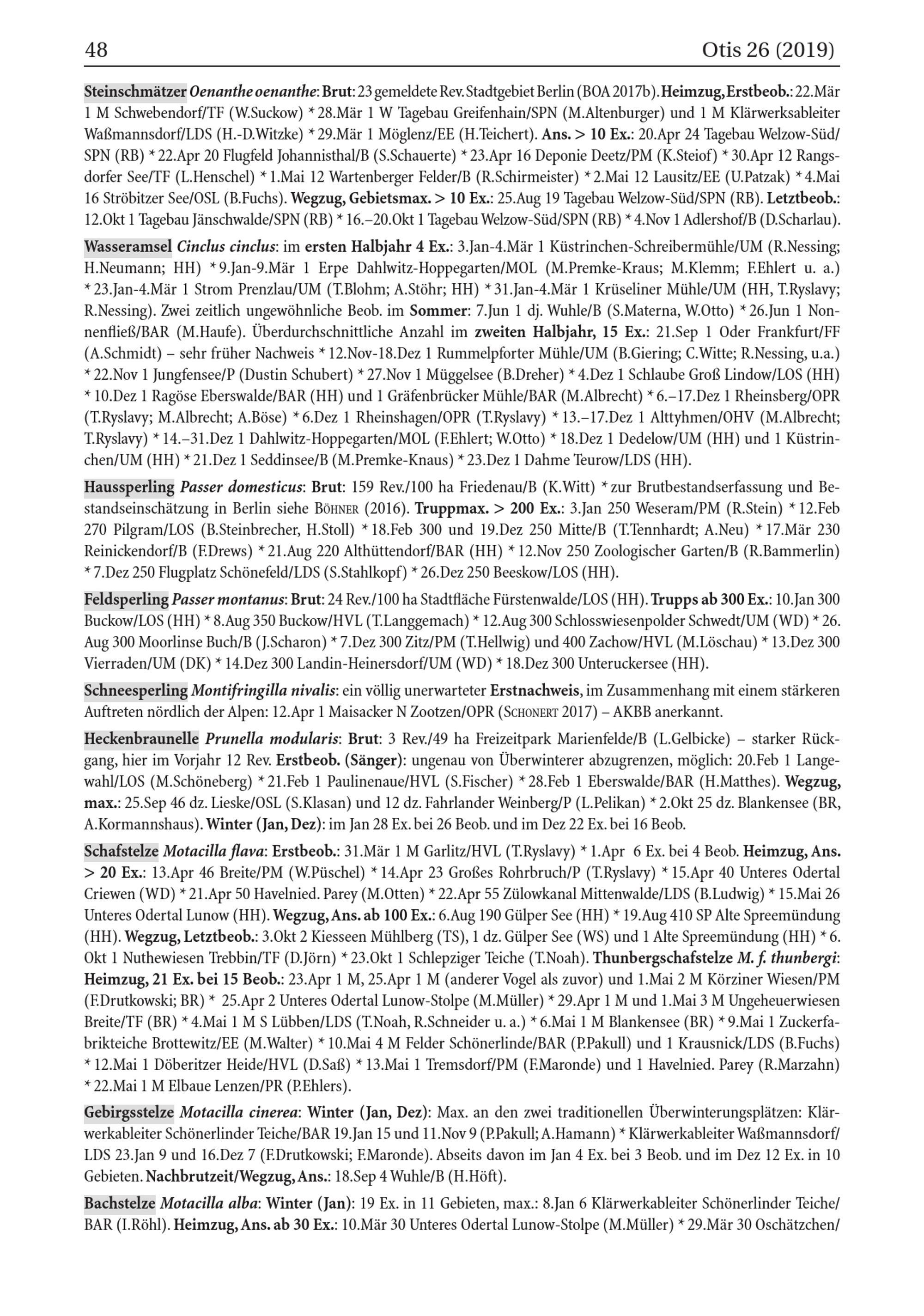 Steinschmätzer Oenanthe oenanthe: Brut: 23 gemeldete Rev. Stadtgebiet Berlin( BOA 2017b). Heimzug, Erstbeob.: 22.Mär 1 M Schwebendorf/ TF( W.Suckow)* 28. Mär 1 W Tagebau Greifenhain/ SPN ( M.Altenburger) und 1 M Klärwerksableiter Waẞmannsdorf/ LDS ( H.- D.Witzke)* 29.Mär 1 Möglenz/ EE( H.Teichert). Ans.> 10 Ex.: 20.Apr 24 Tagebau Welzow- Süd/ SPN ( RB)* 22.Apr 20 Flugfeld Johannisthal / B( S.Schauerte)* 23.Apr 16 Deponie Deetz/ PM( K.Steiof)* 30.Apr 12 Rangs dorfer See/ TF( L.Henschel)* 1.Mai 12 Wartenberger Felder/ B( R.Schirmeister)* 2.Mai 12 Lausitz/ EE( U.Patzak)* 4.Mai 16 Ströbitzer See/ OSL ( B.Fuchs). Wegzug, Gebietsmax.> 10 Ex.: 25.Aug 19 Tagebau Welzow- Süd/ SPN ( RB). Letztbeob.: 12.Okt 1 Tagebau Jänschwalde/ SPN ( RB)* 16.- 20.Okt 1 Tagebau Welzow- Süd/ SPN ( RB)* 4.Nov 1 Adlershof / B( D.Scharlau). Wasseramsel Cinclus cinclus: im ersten Halbjahr 4 Ex.: 3.Jan- 4.Mär 1 Küstrinchen- Schreibermühle/ UM( R.Nessing; H.Neumann; HH )* 9.Jan- 9.Mär 1 Erpe Dahlwitz- Hoppegarten/ MOL( M.Premke- Kraus; M.Klemm; F.Ehlert u. a.) * 23.Jan- 4.Mär 1 Strom Prenzlau / UM( T.Blohm; A.Stöhr; HH )* 31.Jan- 4.Mär 1 Krüseliner Mühle/ UM( HH, T.Ryslavy; R.Nessing). Zwei zeitlich ungewöhnliche Beob. im Sommer: 7.Jun 1 dj. Wuhle/ B( S.Materna, W.Otto)* 26.Jun 1 Nonnenflieẞ/ BAR( M.Haufe). Überdurchschnittliche Anzahl im zweiten Halbjahr, 15 Ex.: 21.Sep 1 Oder Frankfurt / FF ( A.Schmidt)- sehr früher Nachweis* 12.Nov- 18.Dez 1 Rummelpforter Mühle/ UM( B.Giering; C.Witte; R.Nessing, u.a.) * 22. Nov 1 Jungfensee/ P( Dustin Schubert)* 27.Nov 1 Müggelsee( B.Dreher)* 4.Dez 1 Schlaube Groß Lindow/ LOS( HH) * 10.Dez 1 Ragöse Eberswalde / BAR( HH ) und 1 Gräfenbrücker Mühle/ BAR( M.Albrecht)* 6.- 17.Dez 1 Rheinsberg / OPR ( T.Ryslavy; M.Albrecht; A.Böse)* 6.Dez 1 Rheinshagen/ OPR ( T.Ryslavy)* 13.- 17.Dez 1 Alttyhmen/ OHV ( M.Albrecht; T.Ryslavy)* 14.- 31.Dez 1 Dahlwitz- Hoppegarten/ MOL( F.Ehlert; W.Otto)* 18.Dez 1 Dedelow/ UM( HH ) und 1 Küstrin chen / UM( HH )* 21.Dez 1 Seddinsee/ B( M.Premke- Knaus)* 23.Dez 1 Dahme Teurow/ LDS ( HH ). Haussperling Passer domesticus : Brut: 159 Rev./100 ha Friedenau / B( K.Witt )* zur Brutbestandserfassung und Bestandseinschätzung in Berlin siehe BÖHNER( 2016). Truppmax.> 200 Ex.: 3.Jan 250 Weseram/ PM( R.Stein)* 12.Feb 270 Pilgram/ LOS( B.Steinbrecher, H.Stoll)* 18.Feb 300 und 19.Dez 250 Mitte/ B( T.Tennhardt; A.Neu)* 17.Mär 230 Reinickendorf / B( F.Drews)* 21.Aug 220 Althüttendorf / BAR( HH )* 12.Nov 250 Zoologischer Garten/ B( R.Bammerlin) * 7.Dez 250 Flugplatz Schönefeld / LDS ( S.Stahlkopf)* 26.Dez 250 Beeskow / LOS( HH).
