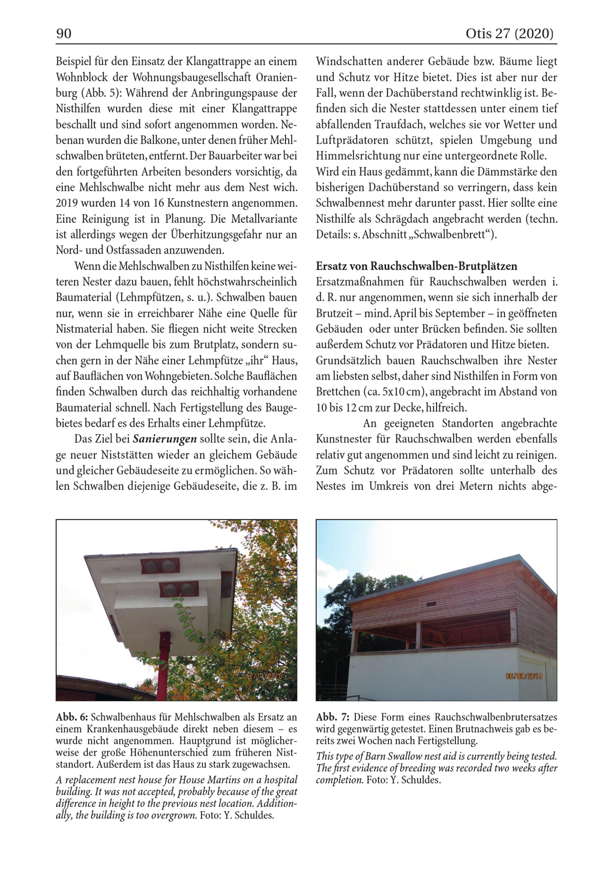 Beispiel für den Einsatz der Klangattrappe an einem Wohnblock der Wohnungsbaugesellschaft Oranienburg( Abb. 5): Während der Anbringungspause der Nisthilfen wurden diese mit einer Klangattrappe beschallt und sind sofort angenommen worden. Nebenan wurden die Balkone, unter denen früher Mehlschwalben brüteten, entfernt. Der Bauarbeiter war bei den fortgeführten Arbeiten besonders vorsichtig, da eine Mehlschwalbe nicht mehr aus dem Nest wich. 2019 wurden 14 von 16 Kunstnestern angenommen. Eine Reinigung ist in Planung. Die Metallvariante ist allerdings wegen der Überhitzungsgefahr nur an Nord- und Ostfassaden anzuwenden.