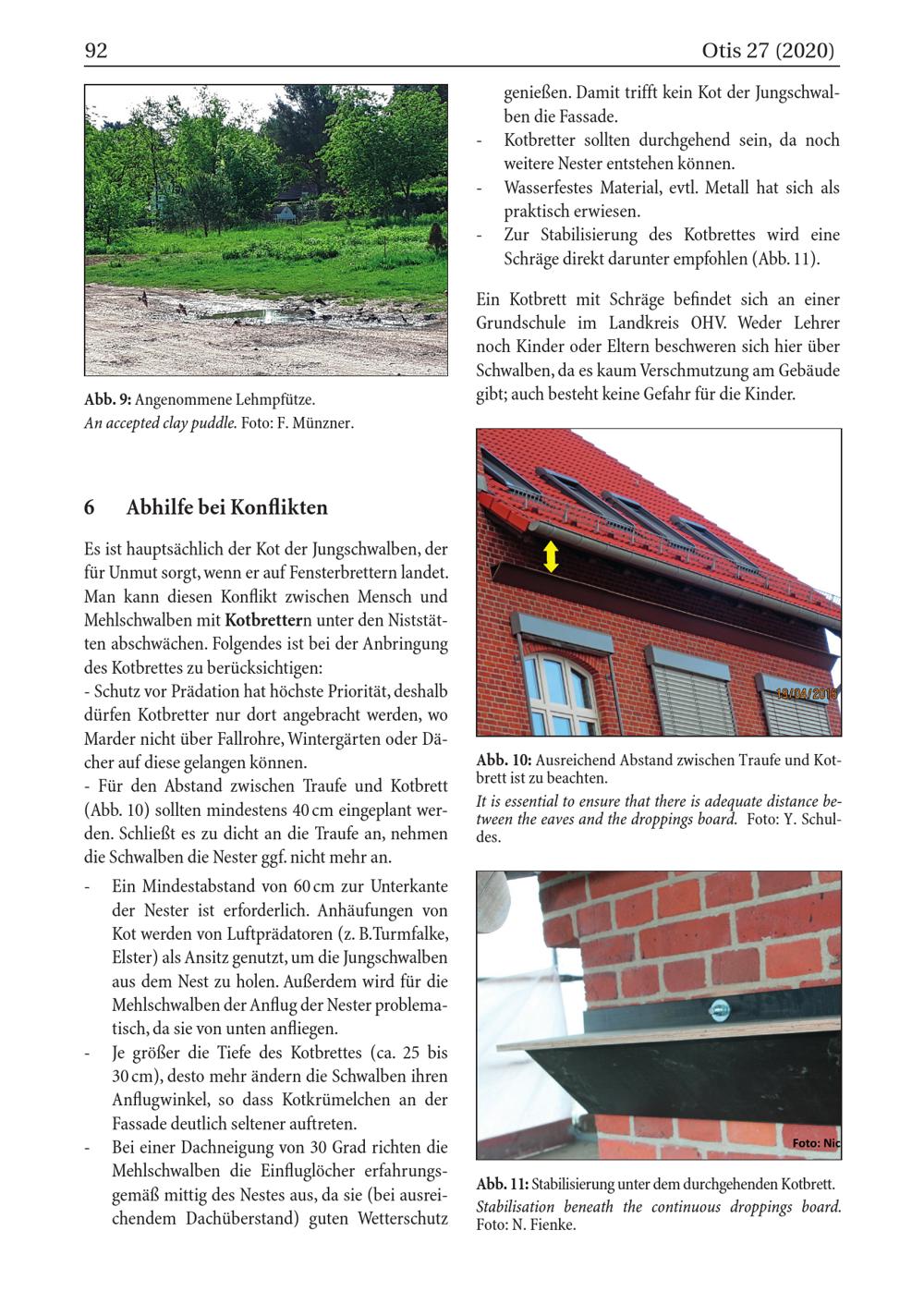 Ein Mindestabstand von 60 cm zur Unterkante der Nester ist erforderlich. Anhäufungen von Kot werden von Luftprädatoren( z. B. Turmfalke, Elster) als Ansitz genutzt, um die Jungschwalben aus dem Nest zu holen. Außerdem wird für die Mehlschwalben der Anflug der Nester problematisch, da sie von unten anfliegen.