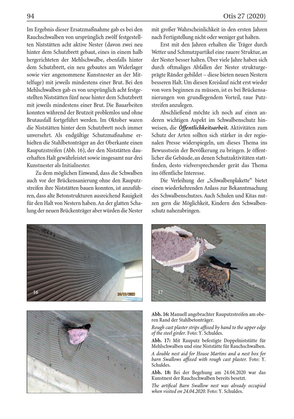 Im Ergebnis dieser Ersatzmaßnahme gab es bei den Rauchschwalben von ursprünglich zwölf festgestellten Niststätten acht aktive Nester( davon zwei neu hinter dem Schutzbrett gebaut, eines in einem halb hergerichteten der Mehlschwalbe, ebenfalls hinter dem Schutzbrett, ein neu gebautes am Widerlager sowie vier angenommene Kunstnester an der Mittelfuge) mit jeweils mindestens einer Brut. Bei den Mehlschwalben gab es von ursprünglich acht festgestellten Niststätten fünf neue hinter dem Schutzbrett mit jeweils mindestens einer Brut. Die Bauarbeiten konnten während der Brutzeit problemlos und ohne Brutausfall fortgeführt werden. Im Oktober waren die Niststätten hinter dem Schutzbrett noch immer unversehrt. Als endgültige Schutzmaßnahme erhielten die Stahlbetonträger an der Oberkante einen Rauputzstreifen( Abb. 16), der den Niststätten dauerhaften Halt gewährleistet sowie insgesamt nur drei Kunstnester als Initialnester.