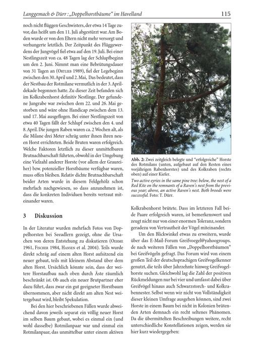 Um den Blickwinkel etwas zu erweitern, wurde über das E- Mail- Forum Greifvoegel@ yahoogroups. de nach weiteren Fällen von„ Doppelhorstbäumen“ bei Greifvögeln gefragt. Das Forum wird von einem großen Teil der deutschsprachigen Greifvogelkenner genutzt, die teils über Jahrzehnte hinweg Greifvogelhorste suchen. Gleichwohl lag die Zahl der positiven Rückmeldungen nur bei vier und umfasst dabei über Greifvögel hinaus auch Schwarzstorch- und Kolkrabennester. Selbst wenn wir nicht von Vollständigkeit dieser kleinen Umfrage ausgehen können, sind zwei Horste in einem Baum bei nicht in Kolonien brütenden Arten demnach ein recht seltenes Phänomen. Da die übermittelten Beschreibungen weitere, recht unterschiedliche Konstellationen zeigen, werden sie hier kurz wiedergegeben: