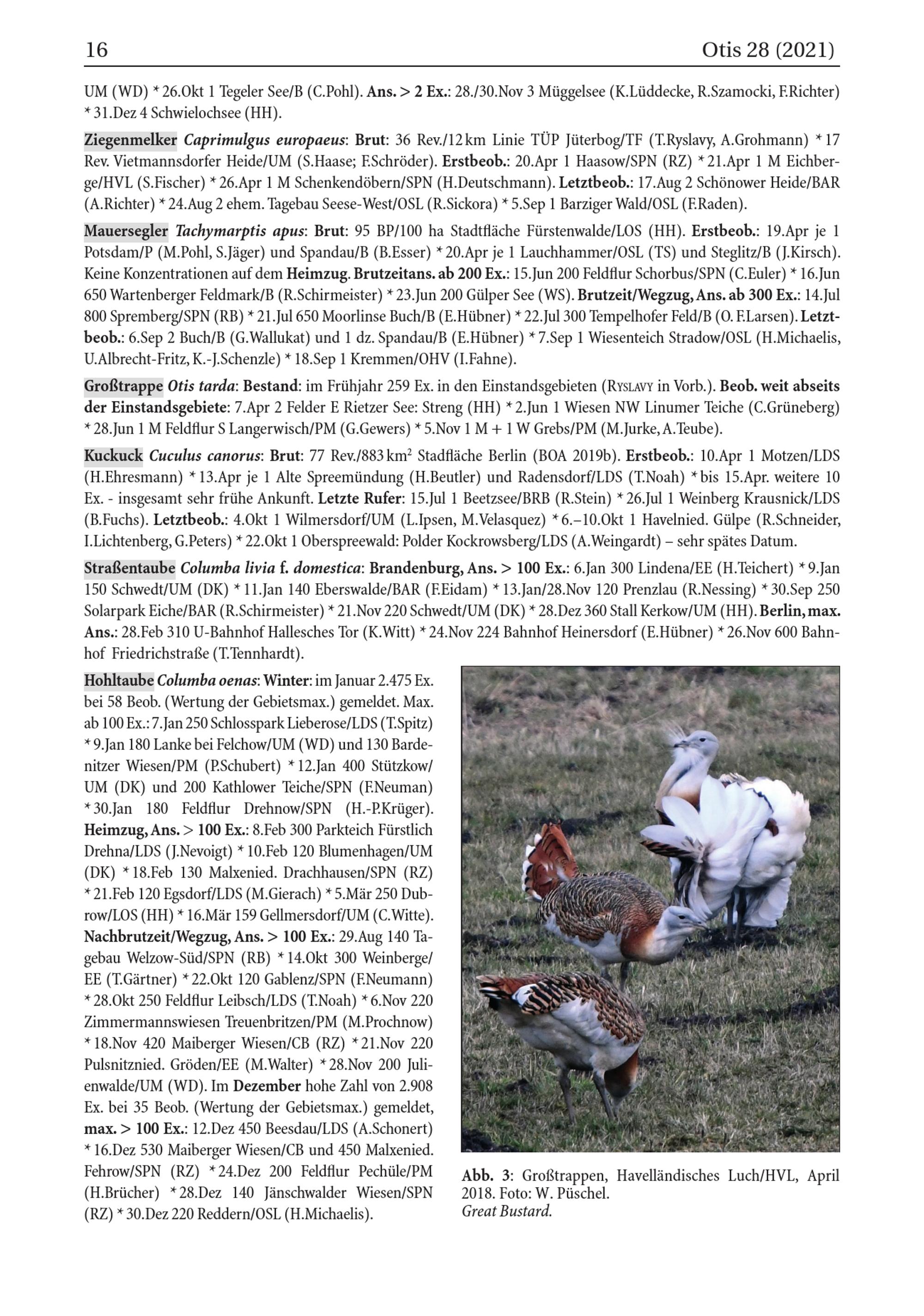 Groẞtrappe Otis tarda: Bestand: im Frühjahr 259 Ex. in den Einstandsgebieten( RYSLAVY in Vorb.). Beob. weit abseits der Einstandsgebiete: 7.Apr 2 Felder E Rietzer See: Streng( HH )* 2.Jun 1 Wiesen NW Linumer Teiche( C.Grüneberg) * 28. Jun 1 M Feldflur S Langerwisch/ PM( G.Gewers)* 5.Nov 1 M+ 1 W Grebs/ PM( M. Jurke, A. Teube). Kuckuck Cuculus canorus : Brut: 77 Rev./883 km² Stadfläche Berlin ( BOA 2019b). Erstbeob.: 10.Apr 1 Motzen/ LDS ( H.Ehresmann)* 13.Apr je 1 Alte Spreemündung( H.Beutler) und Radensdorf/ LDS ( T.Noah)* bis 15.Apr. weitere 10 Ex. insgesamt sehr frühe Ankunft. Letzte Rufer: 15.Jul 1 Beetzsee/ BRB ( R.Stein)* 26.Jul 1 Weinberg Krausnick / LDS ( B.Fuchs). Letztbeob.: 4.Okt 1 Wilmersdorf/ UM( L.Ipsen, M.Velasquez)* 6.- 10.Okt 1 Havelnied. Gülpe( R.Schneider, I.Lichtenberg, G.Peters)* 22.Okt 1 Oberspreewald : Polder Kockrowsberg/ LDS ( A.Weingardt)- sehr spätes Datum. Straßentaube Columba livia f. domestica: Brandenburg , Ans.> 100 Ex.: 6.Jan 300 Lindena/ EE( H.Teichert)* 9.Jan 150 Schwedt/ UM( DK)* 11.Jan 140 Eberswalde/ BAR( F.Eidam)* 13.Jan/ 28.Nov 120 Prenzlau ( R.Nessing)* 30.Sep 250 Solarpark Eiche/ BAR( R.Schirmeister)* 21.Nov 220 Schwedt / UM( DK)* 28.Dez 360 Stall Kerkow/ UM( HH). Berlin , max. Ans.: 28.Feb 310 U- Bahnhof Hallesches Tor( K.Witt )* 24.Nov 224 Bahnhof Heinersdorf( E.Hübner)* 26.Nov 600 Bahn hof Friedrichstraße ( T.Tennhardt).