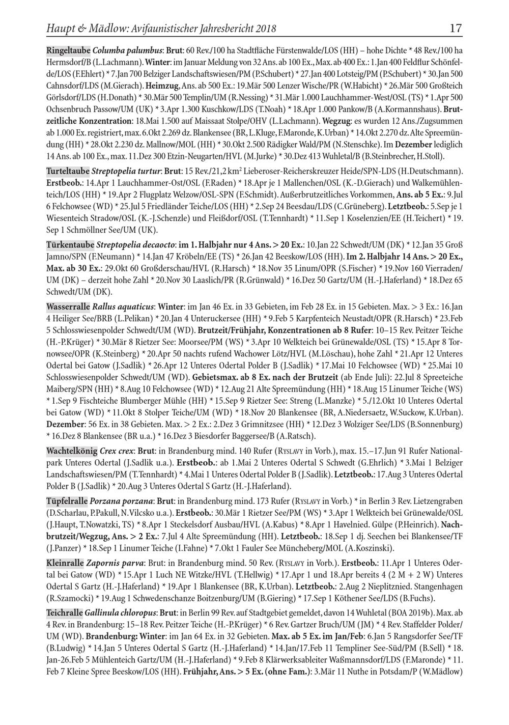 Kleinralle Zapornis parva: Brut: in Brandenburg mind. 50 Rev.( RYSLAVY in Vorb.). Erstbeob.: 11.Apr 1 Unteres Odertal bei Gatow( WD)* 15.Apr 1 Luch NE Witzke/ HVL ( T.Hellwig)* 17.Apr 1 und 18.Apr bereits 4( 2 M+ 2 W) Unteres Odertal S Gartz( H.- J.Haferland)* 19.Apr 1 Blankensee( BR , K.Urban). Letztbeob.: 2.Aug 2 Nieplitznied. Stangenhagen ( R.Szamocki)* 19.Aug 1 Schwedenschanze Boitzenburg/ UM( B.Giering)* 17.Sep 1 Köthener See/ LDS ( B.Fuchs). Teichralle Gallinula chloropus: Brut: in Berlin 99 Rev. auf Stadtgebiet gemeldet, davon 14 Wuhletal( BOA 2019b). Max. ab 4 Rev. in Brandenburg : 15-18 Rev. Peitzer Teiche( H.- P.Krüger)* 6 Rev. Gartzer Bruch/ UM( JM)* 4 Rev. Staffelder Polder/ UM( WD). Brandenburg : Winter: im Jan 64 Ex. in 32 Gebieten. Max. ab 5 Ex. im Jan/ Feb: 6.Jan 5 Rangsdorfer See/ TF ( B.Ludwig)* 14.Jan 5 Unteres Odertal S Gartz( H.- J.Haferland)* 14.Jan/ 17.Feb 11 Templiner See- Süd/ PM( B.Sell)* 18. Jan- 26.Feb 5 Mühlenteich Gartz / UM( H.- J.Haferland)* 9.Feb 8 Klärwerksableiter Waßmannsdorf/ LDS ( F.Maronde)* 11. Feb 7 Kleine Spree Beeskow / LOS( HH ). Frühjahr, Ans.> 5 Ex.( ohne Fam.): 3.Mär 11 Nuthe in Potsdam / P( W.Mädlow)
