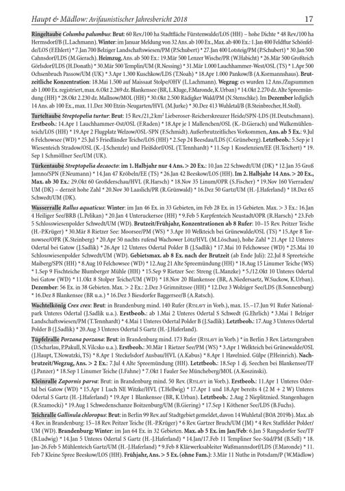 Ringeltaube Columba palumbus : Brut: 60 Rev./100 ha Stadtfläche Fürstenwalde / LOS( HH )- hohe Dichte* 48 Rev./100 ha Hermsdorf/ B( L.Lachmann). Winter: im Januar Meldung von 32 Ans. ab 100 Ex., Max. ab 400 Ex.: 1.Jan 400 Feldflur Schönfel de / LOS( F.Ehlert)* 7.Jan 700 Belziger Landschaftswiesen/ PM( P.Schubert)* 27.Jan 400 Lotsteig/ PM( P.Schubert)* 30.Jan 500 Cahnsdorf/ LDS ( M.Gierach). Heimzug, Ans. ab 500 Ex.: 19.Mär 500 Lenzer Wische / PR( W.Habicht)* 26.Mär 500 Großteich Görlsdorf/ LDS ( H.Donath)* 30.Mär 500 Templin / UM( R.Nessing)* 31.Mär 1.000 Lauchhammer- West/ OSL ( TS)* 1.Apr 500 Ochsenbruch Passow/ UM( UK)* 3.Apr 1.300 Kuschkow/ LDS ( T.Noah)* 18.Apr 1.000 Pankow / B( A.Kormannshaus). Brutzeitliche Konzentration: 18.Mai 1.500 auf Maissaat Stolpe / OHV ( L.Lachmann). Wegzug: es wurden 12 Ans./Zugsummen ab 1.000 Ex. registriert, max. 6.Okt 2.269 dz. Blankensee( BR , L.Kluge, F.Maronde, K.Urban)* 14.Okt 2.270 dz. Alte Spreemündung( HH )* 28.Okt 2.230 dz. Mallnow/ MOL( HH )* 30.Okt 2.500 Rädigker Wald/ PM( N.Stenschke). Im Dezember lediglich 14 Ans. ab 100 Ex., max. 11.Dez 300 Etzin- Neugarten/ HVL ( M.Jurke)* 30.Dez 413 Wuhletal/ B( B.Steinbrecher, H.Stoll). Turteltaube Streptopelia turtur: Brut: 15 Rev./21,2 km² Lieberoser - Reicherskreuzer Heide/ SPN - LDS ( H.Deutschmann). Erstbeob.: 14.Apr 1 Lauchhammer- Ost/ OSL ( F.Raden)* 18.Apr je 1 Mallenchen/ OSL ( K.- D.Gierach) und Walkemühlenteich/ LOS( HH)* 19.Apr 2 Flugplatz Welzow / OSL - SPN ( F.Schmidt). Außerbrutzeitliches Vorkommen, Ans. ab 5 Ex.: 9.Jul 6 Felchowsee( WD)* 25.Jul 5 Friedländer Teiche/ LOS( HH )* 2.Sep 24 Beesdau/ LDS ( C.Grüneberg). Letztbeob.: 5.Sep je 1 Wiesenteich Stradow/ OSL ( K.- J.Schenzle) und Fleißdorf/ OSL ( T.Tennhardt)* 11.Sep 1 Koselenzien/ EE( H.Teichert)* 19. Sep 1 Schmöllner See/ UM( UK).