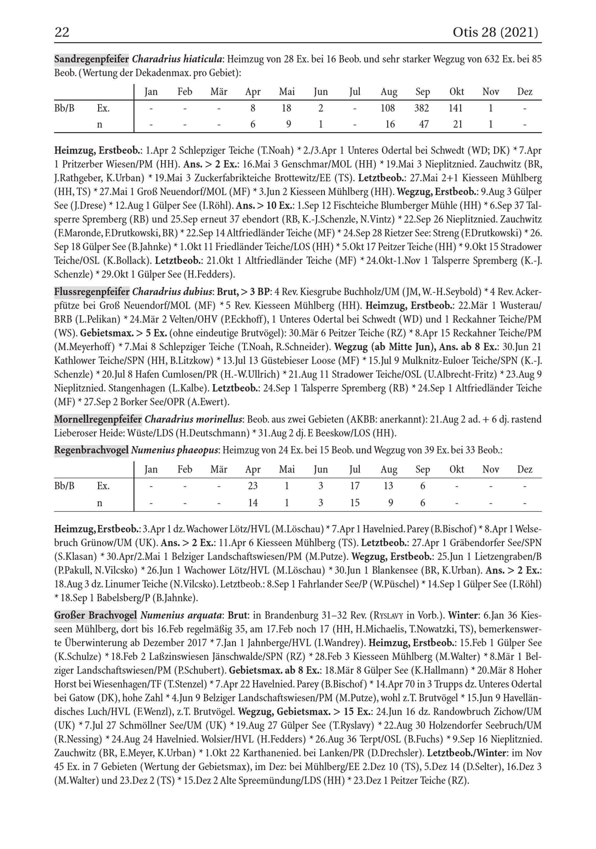Großer Brachvogel Numenius arquata : Brut: in Brandenburg 31-32 Rev.( RYSLAVY in Vorb.). Winter: 6.Jan 36 Kiesseen Mühlberg , dort bis 16.Feb regelmäßig 35, am 17.Feb noch 17( HH, H.Michaelis, T.Nowatzki, TS), bemerkenswerte Überwinterung ab Dezember 2017* 7.Jan 1 Jahnberge/ HVL ( I.Wandrey). Heimzug, Erstbeob.: 15.Feb 1 Gülper See ( K.Schulze)* 18.Feb 2 Laẞzinswiesen Jänschwalde / SPN ( RZ)* 28. Feb 3 Kiesseen Mühlberg ( M.Walter)* 8.Mär 1 Belziger Landschaftswiesen/ PM( P.Schubert). Gebietsmax. ab 8 Ex.: 18.Mär 8 Gülper See( K.Hallmann)* 20.Mär 8 Hoher Horst bei Wiesenhagen/ TF( T.Stenzel)* 7.Apr 22 Havelnied. Parey ( B.Bischof)* 14.Apr 70 in 3 Trupps dz. Unteres Odertal bei Gatow ( DK), hohe Zahl* 4. Jun 9 Belziger Landschaftswiesen/ PM( M.Putze), wohl z.T. Brutvögel* 15.Jun 9 Havelländisches Luch/ HVL ( F.Wenzl), z.T. Brutvögel. Wegzug, Gebietsmax.> 15 Ex.: 24.Jun 16 dz. Randowbruch Zichow/ UM ( UK)* 7.Jul 27 Schmöllner See/ UM( UK)* 19.Aug 27 Gülper See( T.Ryslavy)* 22.Aug 30 Holzendorfer Seebruch/ UM ( R.Nessing)* 24.Aug 24 Havelnied. Wolsier/ HVL ( H.Fedders)* 26.Aug 36 Terpt/ OSL ( B.Fuchs)* 9.Sep 16 Nieplitznied. Zauchwitz ( BR , E.Meyer, K.Urban)* 1.Okt 22 Karthanenied. bei Lanken/ PR( D.Drechsler). Letztbeob./Winter: im Nov 45 Ex. in 7 Gebieten( Wertung der Gebietsmax), im Dez: bei Mühlberg/ EE 2.Dez 10( TS), 5.Dez 14( D.Selter), 16.Dez 3 ( M. Walter) und 23.Dez 2( TS)* 15.Dez 2 Alte Spreemündung/ LDS ( HH )* 23.Dez 1 Peitzer Teiche( RZ).