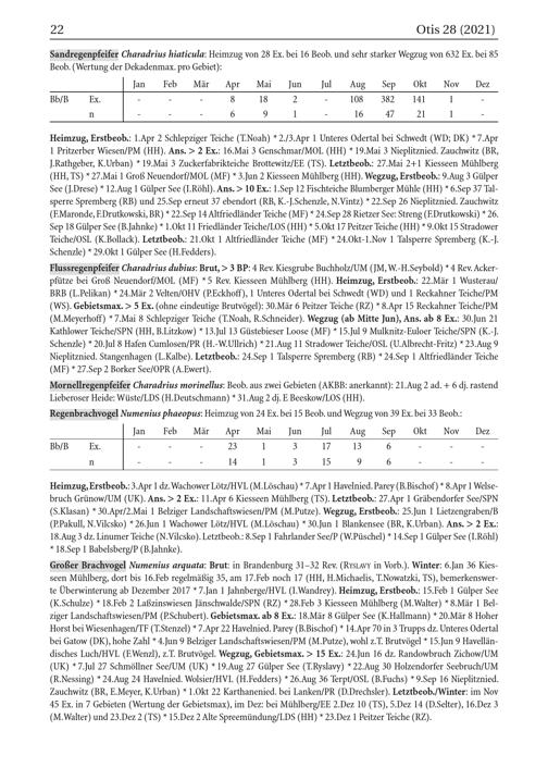Sandregenpfeifer Charadrius hiaticula: Heimzug von 28 Ex. bei 16 Beob. und sehr starker Wegzug von 632 Ex. bei 85 Beob.( Wertung der Dekadenmax. pro Gebiet):
