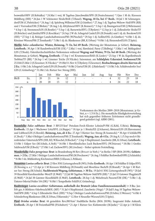 benwalde/ OHV ( H.Kobialka)* 24.Mai 1 vorj. M Tagebau Jänschwalde/ SPN ( H.Deutschmann)* 3.Jun 1 M dz. Kiesseen Mühlberg( HH )* 26.Jun 1 W Schönower Heide/ BAR( T.Hanel). Wegzug, 18 Ex. bei 17 Beob.: 18.Jul 1 M Schmargendorf/ UM( C.Pielsticker)* 24. Aug 1 dj. Spitzberg Willmine/ UM( J.Günther)* 27.Aug 1 dj. Tagebau Welzow- Süd/ SPN ( RB) und 1 Vierraden/ UM( T.Blohm)* 28.Aug 1 dj. Alttyhmen/ OHV ( K.Rennert)* 3.Sep 1 dj. Baumgarten/ UM( J.Wehrmann) 4.Sep 1 dj. Stremmen/ LOS( H.Beutler)* 5.Sep 1 dj. Barnewitz/ HVL ( T.Ryslavy)* 12.Sep je 1 dj. Zellendorfer Heide/ TF ( H.Brücher) und Jämlitz/ SPN ( S.Koschkar)* 24.Sep 2 W dz. Schugetal Caule/ LDS ( H.Donath) und 1 dj. dz. Beeskow / LOS ( HH)* 27.Sep 1 dj. Belziger Landschaftswiesen/ PM( W.Püschel)* 29.Sep 1 dj. Sedlitz / OSL ( A.Günther)* 6.Okt 1 dj. dz. Körziner Wiesen/ PM( T.Tennhardt)* 7.Okt 1 dj. dz. Blankensee ( BR , K.Urban)* 9.Okt 1 dj. Henzendorf/ LOS( T.Spitz). Merlin Falco columbarius: Winter, Heimzug, 71 Ex. bei 69 Beob.( Wertung der Monatsmax. je Gebiet). Heimzug, Letztbeob.: 30.Apr 1 M Randowbruch/ UM( UK)* 2.Mai 1 vorj. Havelnied. Parey ( T.Hellwig)* 3.Mai 1 wf. Byhleguhre/ LDS ( T.Noah). Unterdurchschnittliches Vorkommen während Wegzug und Winter, 79 Ex. bei 68 Beob.( Wertung der Monatsmax. je Gebiet). Wegzug, Erstbeob.: 17.Sep 1 wf. Krummensee/ BAR( K.Lieder)* 25.Sep 1 W dz. Kapellenbusch Trebbin/ TF( BR )* 26.Sep 1 wf. Linumer Teiche( N.Vilcsko). Saisonmax. am Schlafplatz Uckernied. Seehausen/ UM: 25.Feb/ 25.Mär 2( F.Ziesemer; N.Vilcsko)* 19.Okt/ 11.Nov 4( T.Ryslavy; F.Ziesemer). Beobachtungen abseits hiervon ab 2 Ex.: 1 Okt 2 dz. Schugetal Caule/ LDS ( H.Donath)* 8.Okt 2 Gartz/ UM( H.- J.Haferland)* 13.Okt 3 dz. Schlabendorfer See/ LDS ( C.Grüneberg)* 31.Okt 2 dz. Rietzer See: Streng( HH ).