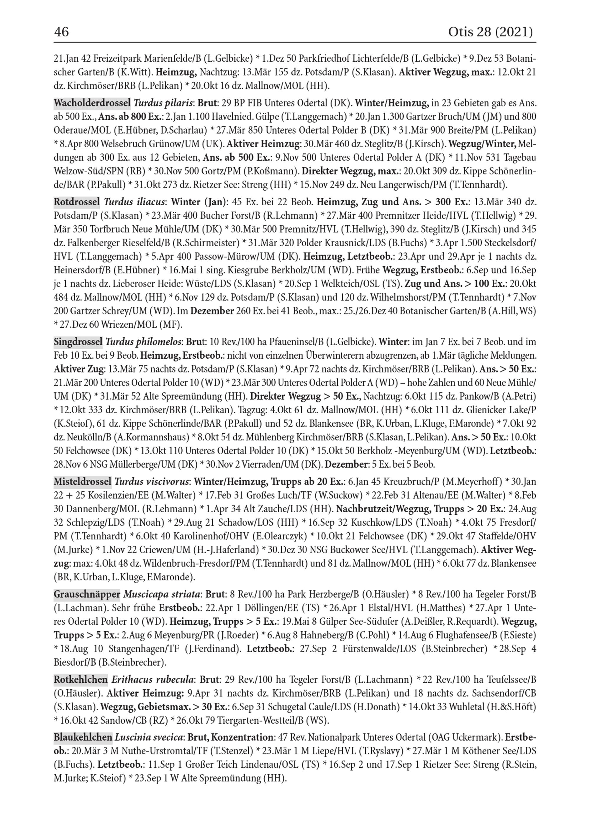Wacholderdrossel Turdus pilaris : Brut: 29 BP FIB Unteres Odertal( DK). Winter/ Heimzug, in 23 Gebieten gab es Ans. ab 500 Ex., Ans. ab 800 Ex.: 2.Jan 1.100 Havelnied. Gülpe( T.Langgemach)* 20. Jan 1.300 Gartzer Bruch/ UM( JM) und 800 Oderaue / MOL( E.Hübner, D.Scharlau)* 27.Mär 850 Unteres Odertal Polder B ( DK)* 31.Mär 900 Breite/ PM( L.Pelikan) * 8.Apr 800 Welsebruch Grünow/ UM( UK). Aktiver Heimzug: 30.Mär 460 dz. Steglitz / B( J.Kirsch). Wegzug/ Winter, Meldungen ab 300 Ex. aus 12 Gebieten, Ans. ab 500 Ex.: 9.Nov 500 Unteres Odertal Polder A( DK)* 11.Nov 531 Tagebau Welzow- Süd/ SPN ( RB)* 30.Nov 500 Gortz/ PM( P.Koßmann). Direkter Wegzug, max.: 20.Okt 309 dz. Kippe Schönerlinde/ BAR( P.Pakull)* 31.Okt 273 dz. Rietzer See: Streng( HH )* 15.Nov 249 dz. Neu Langerwisch/ PM( T.Tennhardt). Rotdrossel Turdus iliacus: Winter( Jan): 45 Ex. bei 22 Beob. Heimzug, Zug und Ans.> 300 Ex.: 13.Mär 340 dz. Potsdam / P( S.Klasan)* 23.Mär 400 Bucher Forst/ B( R.Lehmann)* 27.Mär 400 Premnitzer Heide/ HVL ( T.Hellwig)* 29. Mär 350 Torfbruch Neue Mühle/ UM( DK)* 30.Mär 500 Premnitz / HVL ( T.Hellwig), 390 dz. Steglitz / B( J.Kirsch) und 345 dz. Falkenberger Rieselfeld/ B( R.Schirmeister)* 31.Mär 320 Polder Krausnick / LDS ( B.Fuchs)* 3.Apr 1.500 Steckelsdorf/ HVL ( T.Langgemach)* 5.Apr 400 Passow- Mürow/ UM( DK). Heimzug, Letztbeob.: 23.Apr und 29.Apr je 1 nachts dz. Heinersdorf/ B( E.Hübner)* 16.Mai 1 sing. Kiesgrube Berkholz/ UM( WD). Frühe Wegzug, Erstbeob.: 6.Sep und 16.Sep je 1 nachts dz. Lieberoser Heide : Wüste/ LDS ( S.Klasan)* 20.Sep 1 Welkteich/ OSL ( TS). Zug und Ans.> 100 Ex.: 20.Okt 484 dz. Mallnow/ MOL( HH )* 6.Nov 129 dz. Potsdam / P( S.Klasan) und 120 dz. Wilhelmshorst / PM( T.Tennhardt)* 7.Nov 200 Gartzer Schrey/ UM( WD). Im Dezember 260 Ex. bei 41 Beob., max.: 25./26.Dez 40 Botanischer Garten/ B( A.Hill, WS) * 27.Dez 60 Wriezen / MOL( MF).