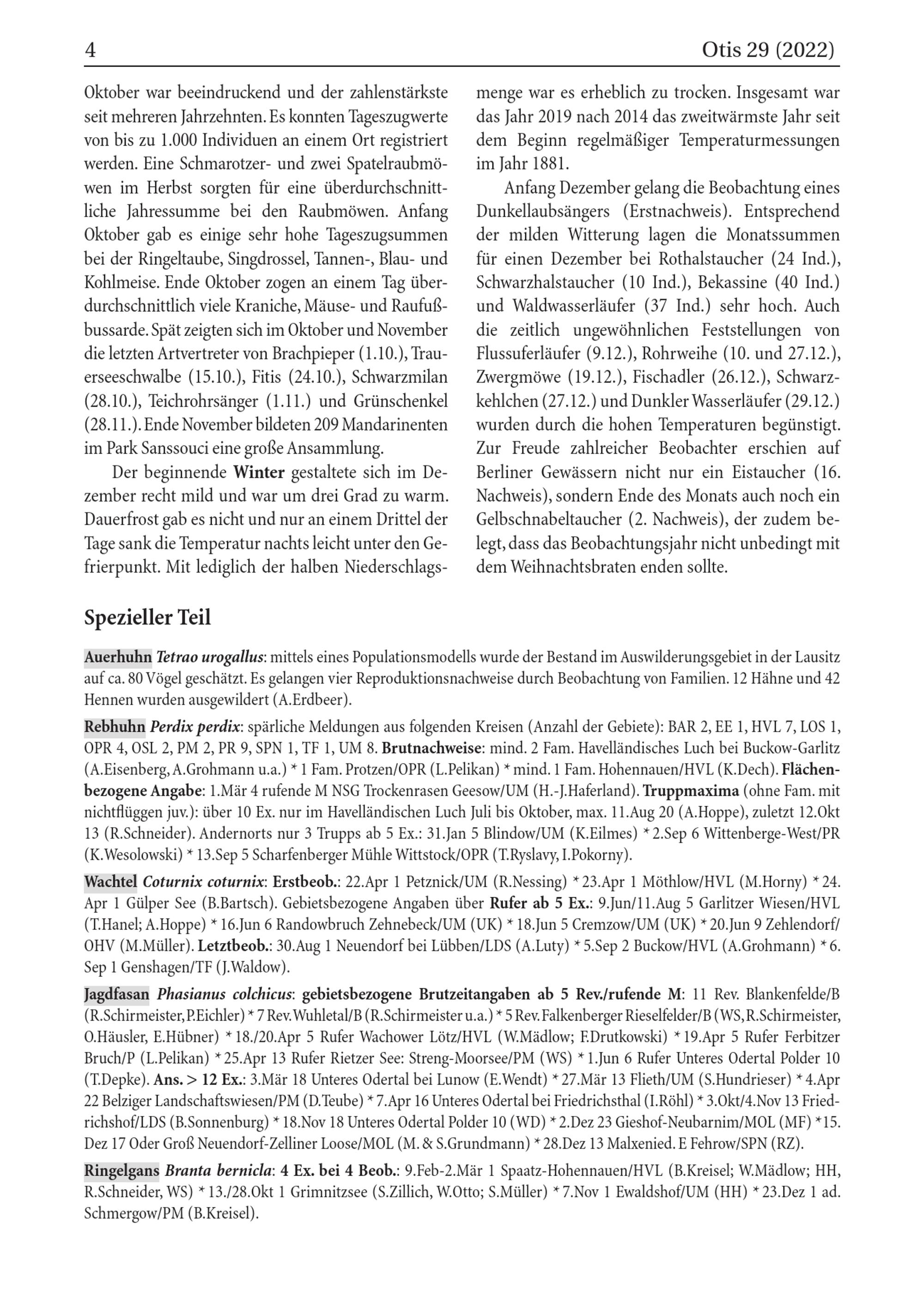 Oktober war beeindruckend und der zahlenstärkste seit mehreren Jahrzehnten. Es konnten Tageszugwerte von bis zu 1.000 Individuen an einem Ort registriert werden. Eine Schmarotzer- und zwei Spatelraubmöwen im Herbst sorgten für eine überdurchschnittliche Jahressumme bei den Raubmöwen. Anfang Oktober gab es einige sehr hohe Tageszugsummen bei der Ringeltaube, Singdrossel, Tannen-, Blau- und Kohlmeise. Ende Oktober zogen an einem Tag überdurchschnittlich viele Kraniche, Mäuse- und Raufußẞbussarde. Spät zeigten sich im Oktober und November die letzten Artvertreter von Brachpieper( 1.10.), Trauerseeschwalbe( 15.10.), Fitis( 24.10.), Schwarzmilan ( 28.10.), Teichrohrsänger( 1.11.) und Grünschenkel ( 28.11.). Ende November bildeten 209 Mandarinenten im Park Sanssouci eine große Ansammlung.