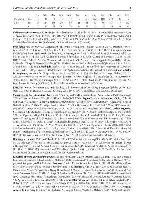 Gebietsmax./Saisonmax.> 10 Ex.: 19.Jan 15 Stoßdorfer See/ LDS ( L.Balke)* 23.Feb 11 Bornim / P ( F.Burmeister)* 4.Apr 22 Sydowswiese/ MOL( MF)* 15.Apr 21 Elbe Abbendorf- Rühstädt/ PR( C.Herche)* 10.Mai 19 Hermannshof- Wentdorf/ PR ( S.Jansen)* 3.Jul 14 Linthe / PM( T.Stenzel)* 16.Jul 20 Rühstädt / PR( K.Wenzel)* 17.Jul 20 Ketzin / HVL ( M.Jurke)* 13.Okt 23 Teichgebiet Vehlefanz/ OHV ( D.Chrobot)* 29.Nov 16 Löhme/ BAR( C.Burow).