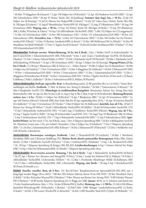 Ohrentaucher Podiceps auritus: Winter/ Heimzug, 10 Ex. bei 8 Beob.: 5.Jan 1 Weißer See/ P( A.Federschmidt)* 6. Jan/ 31.Jan/ 26.Feb 1 Scharmützelsee/ LOS( HH , W.Koschel)* 6.Jan 1 und 12.Jan 2 Senftenberger See / OSL ( H.Michaelis; F.Raden)* 21.Feb 1 Unteres Odertal Polder A( WD)* 23. Feb 1 Fahrlander See/ P( W.Püschel)* 29. Mär 1 Fahrlander See/ P ( B.Krukenberg, W.Püschel)* 14.Apr 2 PK Grimnitzsee( HH )* 20.Apr 1 Gülper See( R.Nessing). Wegzug/ Winter, 23 Ex. bei 13 Beob.: 15./30.Sep 1 Blankensee( BR , K.Urban u.a.) – frühes Datum* 19.Okt 2 Gülper See( E.Maximilian)* 30.Okt 2 Gülper See( H.Fandrey)* 7.Nov 2 Grimnitzsee( HH )* 14.Nov 2 Müggelsee( K.Lüddecke)* 18.Nov 2 Helenesee/ FF( HH ) * 19.Nov 1 Scharmützelsee/ LOS( HH)* 30.Nov 2 Unteruckersee( HH )* 11.Dez 1 Scharmützelsee/ LOS( HH )* 12.Dez 1 Müggelsee( B.Steinbrecher, H.Stoll)* 16.Dez 1 Grimnitzsee( HH , WS)* 20.Dez 3 Tegeler See / B, bis 29.Dez noch 1( T.Hanel, E.Hübner, C.Pohl; L.Gelbicke)* 28.Dez 3 Schwielowsee/ PM( L.Pelikan, W. Püschel).