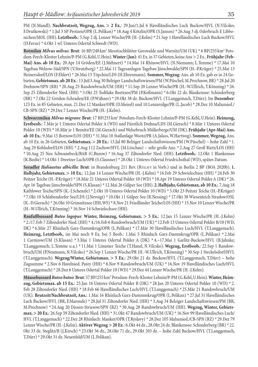 Schwarzmilan Milvus migrans: Brut: 17 BP/ 255 km² Potsdam - Ferch- Kloster Lehnin / P- PM( G.Kehl, U.Hein). Heimzug, Erstbeob.: 7.Mär je 1 Unteres Odertal Polder A( WD) und Fürstlich Drehna / LDS ( M.Gierach)* 8.Mär 1 Unteres Odertal Polder 10( WD)* 10.Mär je 1 Brenitz/ EE( M.Gierach) und Welsebruch Müllerberge/ UM( DK). Frühjahr( Apr- Mai) Ans. ab 10 Ex.: 9.Mai 15 Bornow/ LOS( HH)* 31.Mai 10 Stallanlage Wootz/ PR( A.Jalass, W.Hartweg). Sommer, Wegzug, Ans. ab 10 Ex. in 26 Gebieten, Gebietsmax.> 20 Ex.: 13.Jul 80 Belziger Landschaftswiesen/ PM( W.Püschel)- hohe Zahl* 1. Aug 29 Kohlsdorf/ LOS( HH)* 2.Aug 112 Zachow/ HVL ( M.Löschau) – sehr große Ans.* 2.Aug 27 Groß Rietz/ LOS( HH) * 10.Aug 25 Neu Schwanebeck/ BAR( C.Burow)* 16.Aug 37 Ziltendorfer Nied. ( HH ). Letztbeob.: 12.Okt 1 Blankensee ( K.Beelte)* 14.Okt 1 Dreetzer Luch/ OPR ( S.Clausner)* 28.Okt 1 Unteres Odertal Friedrichsthal( WD), spätes Datum. Seeadler Haliaeetus albicilla : Brut: in Brandenburg 211 Rev.( RYSLAVY in Vorb.) und in Berlin 2 BP( BOA 2020b). 1. Halbjahr, Gebietsmax.> 10 Ex.: 12.Jan 14 Lenzer Wische/ PR( H.- J.Kelm)* 16.Feb 29 Schwielochsee( HH )* 24. Feb 30 Peitzer Teiche( H.- P.Krüger)* 18.Mär 21 Unteres Odertal Polder 10( WD)* 10.Apr 19 Unteres Odertal Polder A( DK)* 26. Apr 16 Tagebau Jänschwalde/ SPN ( S.Klasan)* 12.Mai 26 Gülper See( HH ). 2. Halbjahr, Gebietsmax. ab 10 Ex.: 7.Aug 18 Kathlower Teiche/ SPN ( K.- J.Schenzle)* 2.Okt 10 Unteres Odertal Polder 10( WD)* 5.Okt 23 Peitzer Teiche( H.- P.Krüger) * 7.Okt 10 Schlabendorfer See/ LDS ( J.Nevoigt)* 10.Okt 11 Gülper See( R.Nessing)* 17.Okt 38 Wiesenteich Stradow/ OSL ( K.- D.Gierach)* 26.Okt 10 Grimnitzsee( HH , WS)* 8.Nov 21 Friedländer Teiche/ LOS( HH)* 15.Nov 10 Lenzer Wische / PR ( H.- W.Ullrich, T.Könning)* 16.Nov 14 Schwielochsee( HH ).