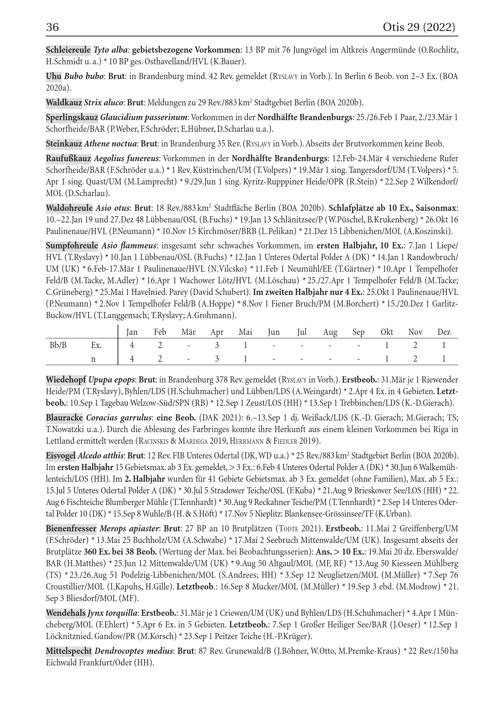 Waldohreule Asio otus : Brut: 18 Rev./883 km² Stadtfläche Berlin ( BOA 2020b). Schlafplätze ab 10 Ex., Saisonmax: 10.- 22.Jan 19 und 27.Dez 48 Lübbenau / OSL ( B.Fuchs)* 19.Jan 13 Schlänitzsee/ P( W.Püschel, B.Krukenberg)* 26.Okt 16 Paulinenaue / HVL ( P.Neumann)* 10.Nov 15 Kirchmöser/ BRB ( L.Pelikan)* 21.Dez 15 Libbenichen / MOL( A.Koszinski). Sumpfohreule Asio flammeus: insgesamt sehr schwaches Vorkommen, im ersten Halbjahr, 10 Ex.: 7.Jan 1 Liepe/ HVL ( T.Ryslavy)* 10.Jan 1 Lübbenau/ OSL ( B.Fuchs)* 12.Jan 1 Unteres Odertal Polder A( DK)* 14.Jan 1 Randowbruch/ UM( UK )* 6.Feb- 17.Mär 1 Paulinenaue / HVL ( N.Vilcsko)* 11.Feb 1 Neumühl/ EE( T.Gärtner)* 10.Apr 1 Tempelhofer Feld/ B( M.Tacke, M.Adler)* 16.Apr 1 Wachower Lötz/ HVL ( M.Löschau)* 25./ 27.Apr 1 Tempelhofer Feld/ B( M.Tacke; C.Grüneberg)* 25.Mai 1 Havelnied. Parey( David Schubert). Im zweiten Halbjahr nur 4 Ex.: 25.Okt 1 Paulinenaue/ HVL ( P.Neumann)* 2.Nov 1 Tempelhofer Feld/ B( A.Hoppe)* 8.Nov 1 Fiener Bruch/ PM( M.Borchert)* 15./20.Dez 1 Garlitz­Buckow/ HVL ( T.Langgemach; T.Ryslavy; A.Grohmann).