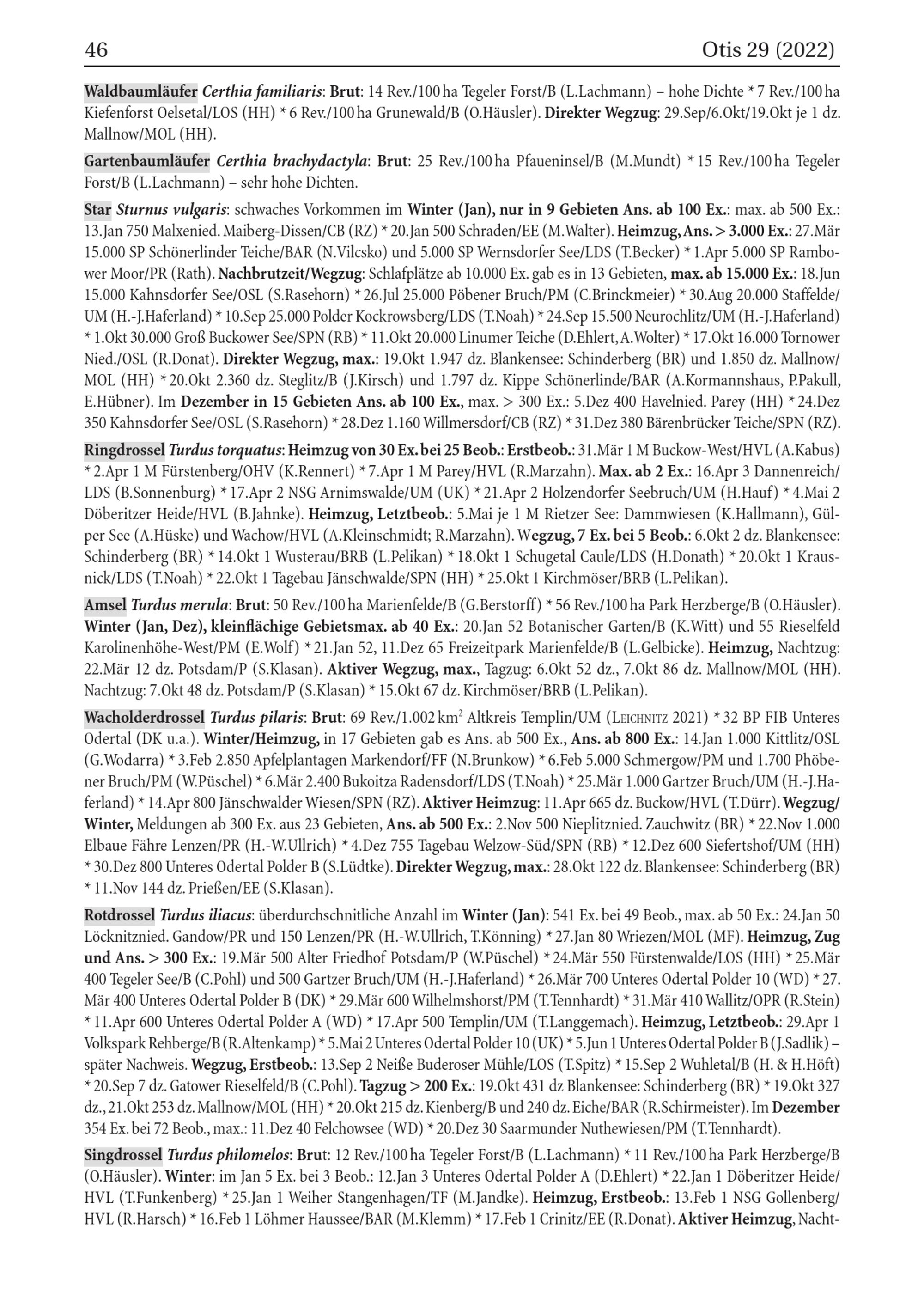 Wacholderdrossel Turdus pilaris : Brut: 69 Rev./1.002 km² Altkreis Templin / UM( LEICHNITZ 2021)* 32 BP FIB Unteres Odertal( DK u.a.). Winter/ Heimzug, in 17 Gebieten gab es Ans. ab 500 Ex., Ans. ab 800 Ex.: 14.Jan 1.000 Kittlitz/ OSL ( G.Wodarra)* 3.Feb 2.850 Apfelplantagen Markendorf / FF( N.Brunkow)* 6.Feb 5.000 Schmergow / PM und 1.700 Phöbener Bruch/ PM( W.Püschel)* 6.Mär 2.400 Bukoitza Radensdorf/ LDS ( T.Noah)* 25.Mär 1.000 Gartzer Bruch/ UM( H.- J.Haferland)* 14.Apr 800 Jänschwalder Wiesen/ SPN ( RZ). Aktiver Heimzug: 11.Apr 665 dz. Buckow/ HVL ( T.Dürr). Wegzug/ Winter, Meldungen ab 300 Ex. aus 23 Gebieten, Ans. ab 500 Ex.: 2.Nov 500 Nieplitznied. Zauchwitz ( BR)* 22.Nov 1.000 Elbaue Fähre Lenzen/ PR( H.- W.Ullrich)* 4.Dez 755 Tagebau Welzow- Süd/ SPN ( RB)* 12.Dez 600 Siefertshof/ UM( HH) * 30. Dez 800 Unteres Odertal Polder B ( S.Lüdtke). Direkter Wegzug, max.: 28.Okt 122 dz. Blankensee: Schinderberg( BR ) * 11.Nov 144 dz. Prießen/ EE( S.Klasan).