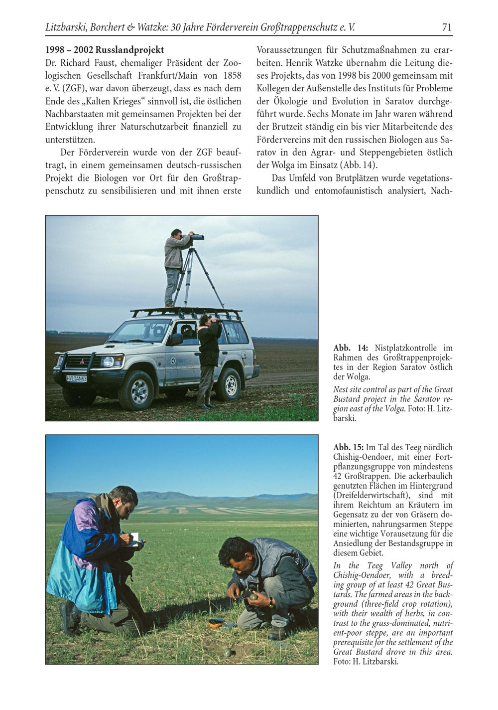 Voraussetzungen für Schutzmaßnahmen zu erarbeiten. Henrik Watzke übernahm die Leitung dieses Projekts, das von 1998 bis 2000 gemeinsam mit Kollegen der Außenstelle des Instituts für Probleme der Ökologie und Evolution in Saratov durchgeführt wurde. Sechs Monate im Jahr waren während der Brutzeit ständig ein bis vier Mitarbeitende des Fördervereins mit den russischen Biologen aus Sa ratov in den Agrar- und Steppengebieten östlich der Wolga im Einsatz( Abb. 14).