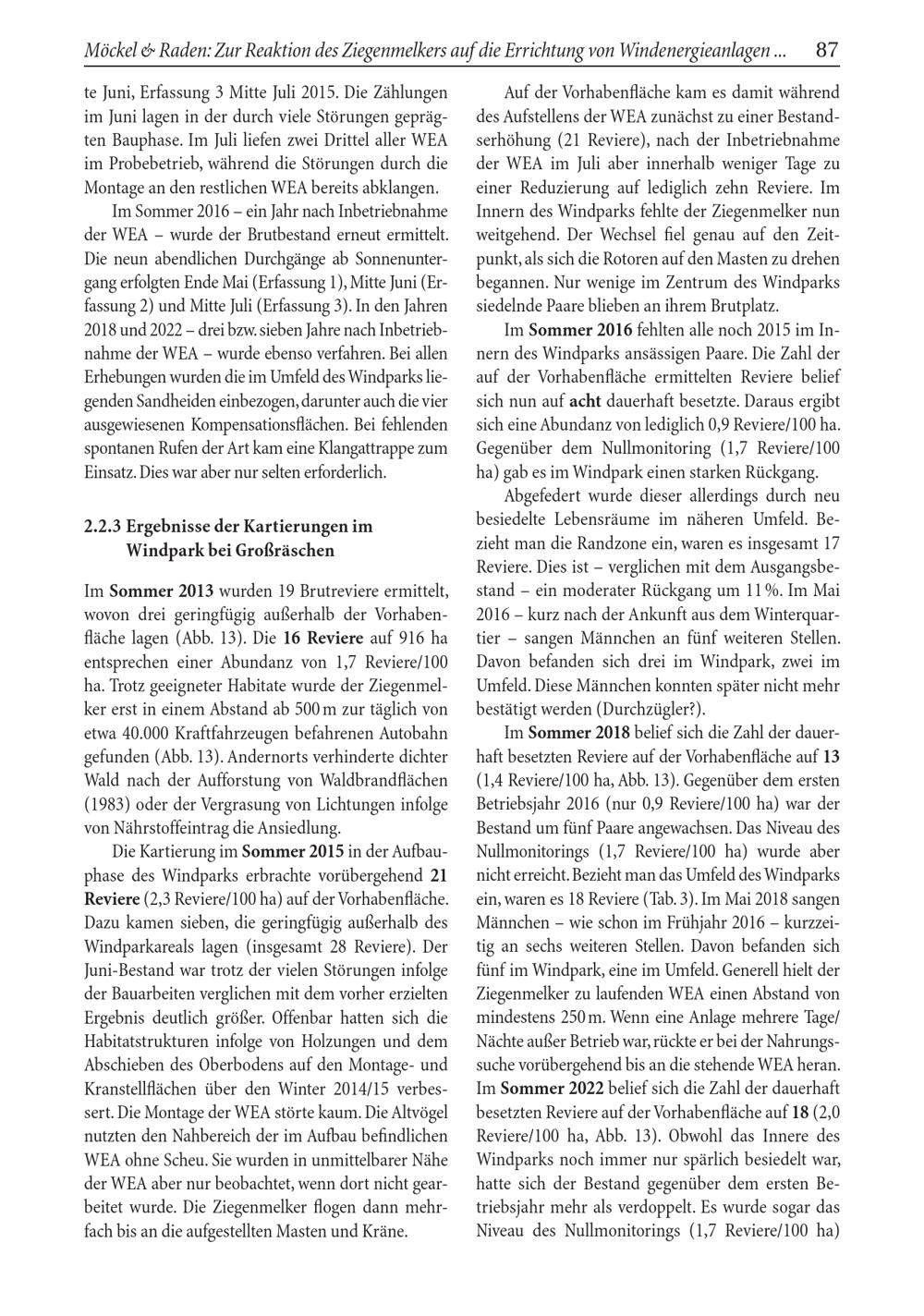 Auf der Vorhabenfläche kam es damit während des Aufstellens der WEA zunächst zu einer Bestandserhöhung( 21 Reviere), nach der Inbetriebnahme der WEA im Juli aber innerhalb weniger Tage zu einer Reduzierung auf lediglich zehn Reviere. Im Innern des Windparks fehlte der Ziegenmelker nun weitgehend. Der Wechsel fiel genau auf den Zeitpunkt, als sich die Rotoren auf den Masten zu drehen begannen. Nur wenige im Zentrum des Windparks siedelnde Paare blieben an ihrem Brutplatz.