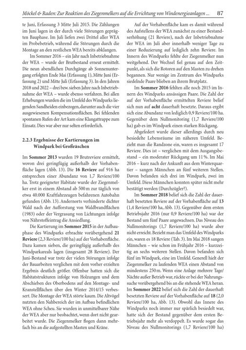 Die Kartierung im Sommer 2015 in der Aufbauphase des Windparks erbrachte vorübergehend 21 Reviere( 2,3 Reviere/ 100 ha) auf der Vorhabenfläche. Dazu kamen sieben, die geringfügig außerhalb des Windparkareals lagen( insgesamt 28 Reviere). Der Juni- Bestand war trotz der vielen Störungen infolge der Bauarbeiten verglichen mit dem vorher erzielten Ergebnis deutlich größer. Offenbar hatten sich die Habitatstrukturen infolge von Holzungen und dem Abschieben des Oberbodens auf den Montage- und Kranstellflächen über den Winter 2014/15 verbessert. Die Montage der WEA störte kaum. Die Altvögel nutzten den Nahbereich der im Aufbau befindlichen WEA ohne Scheu. Sie wurden in unmittelbarer Nähe der WEA aber nur beobachtet, wenn dort nicht gearbeitet wurde. Die Ziegenmelker flogen dann mehrfach bis an die aufgestellten Masten und Kräne.