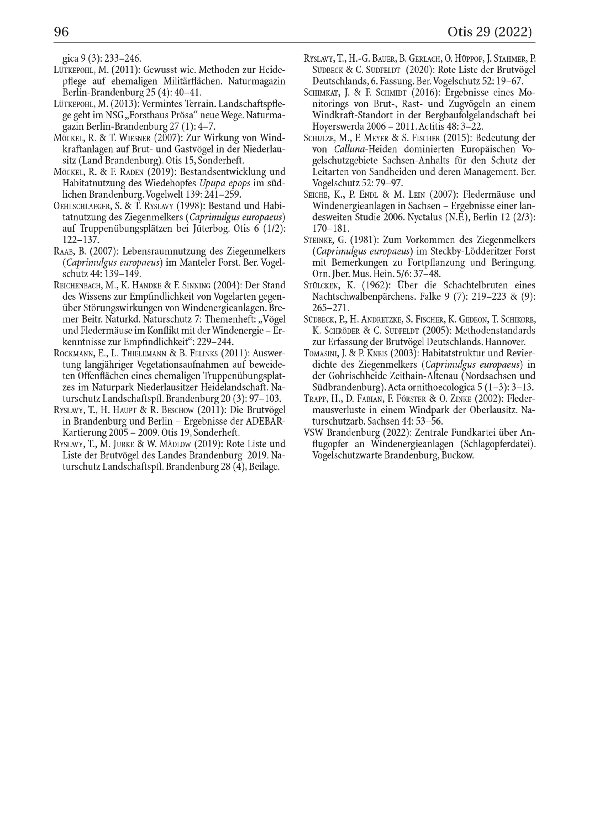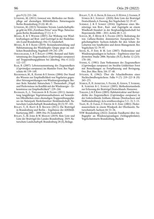 MÖCKEL, R.& T. WIESNER( 2007): Zur Wirkung von Windkraftanlagen auf Brut- und Gastvögel in der Niederlau sitz ( Land Brandenburg ). Otis 15, Sonderheft. MÖCKEL, R.& F. RADEN( 2019): Bestandsentwicklung und Habitatnutzung des Wiedehopfes Upupa epops im südlichen Brandenburg . Vogelwelt 139: 241-259. OEHLSCHLAEGER, S.& T. RYSLAVY( 1998): Bestand und Habitatnutzung des Ziegenmelkers( Caprimulgus europaeus) auf Truppenübungsplätzen bei Jüterbog . Otis 6( 1/2):
