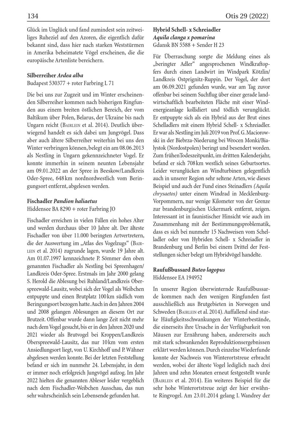 Für Überraschung sorgte die Meldung eines als „ beringter Adler" angesprochenen Windkraftopfers durch einen Landwirt im Windpark Kötzlin/ Landkreis Ostprignitz- Ruppin . Der Vogel, der dort am 06.09.2021 gefunden wurde, war am Tag zuvor offenbar bei seinem Suchflug über einer gerade landwirtschaftlich bearbeiteten Fläche mit einer Windenergieanlage kollidiert und tödlich verunglückt. Er entpuppte sich als ein Hybrid aus der Brut eines Schelladlers mit einem Hybrid Schell- x Schreiadler. Er war als Nestling im Juli 2019 von Prof. G. Maciorowski in der Biebrza- Niederung bei Wrocen Monki/ Bia lystok ( Nordostpolen) beringt und besendert worden. Zum frühen Todeszeitpunkt, im drittten Kalenderjahr, befand er sich 708 km westlich seines Geburtsortes. Leider verunglücken an Windturbinen gelegentlich auch in unserer Region sehr seltene Arten, wie dieses Beispiel und auch der Fund eines Steinadlers( Aquila chrysaetos ) unter einem Windrad in MecklenburgVorpommern, nur wenige Kilometer von der Grenze zur brandenburgischen Uckermark entfernt, zeigen. Interessant ist in faunistischer Hinsicht wie auch im Zusammenhang mit der Bestimmungsproblematik, dass es sich bei nunmehr 15 Nachweisen vom Schelladler oder von Hybriden Schell- x Schreiadler in Brandenburg und Berlin bei einem Drittel der Feststellungen sicher belegt um Hybridvögel handelte.