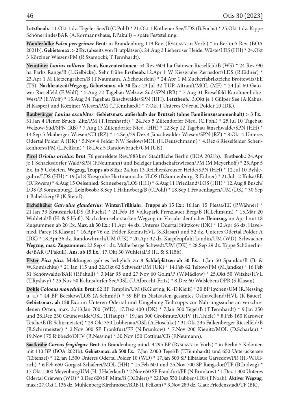 Elster Pica pica: Meldungen gab es lediglich zu 8 Schlafplätzen ab 50 Ex.: 1.Jan 50 Spandau/ B( B.& W.Komischke)* 21.Jan 115 und 22.Okt 62 Schwedt / UM( UK)* 14.Feb 62 Teltow / PM( M.Jandke)* 16.Feb 51 Schönwalde / BAR( P.Pakull)* 3.Mär 95 und 27.Nov 60 Golm/ P( W.Mädlow)* 25.Okt 50 Witzke/ HVL ( T.Ryslavy)* 25.Nov 50 Kahnsdorfer See/ OSL ( U.Albrecht- Fritz)* 8.Dez 60 Walsleben/ OPR ( S.Klasan). Dohle Coloeus monedula: Brut: 62 BP Templin / UM( B.Giering, K.- D.Kleiß)* 30 BP Lychen / UM( R.Nessing u. a.)* 44 BP Beeskow / LOS( A.Schmidt)* 39 BP in Nistkästen gesamtes Osthavelland/ HVL ( K.Bauer). Gebietsmax. ab 150 Ex.: im Unteren Odertal und Umgebung Teiltrupps zur Nahrungssuche an verschie­denen Orten, max. 3./13.Jan 700( WD), 17.Dez 400( DK)* 7.Jan 500 Tegel/ B( T.Tennhardt)* 9.Jan 250 und 28.Dez 230 Grünewalde/ OSL ( J.Haupt)* 19.Jan 300 Großmutz/ OHV ( H.Thiele)* 8. Feb 160 Karower Teiche/ B( R.Schirmeister)* 29.Okt 350 Lübbenau / OSL ( A.Hoschke)* 31.Okt 235 Falkenberger Rieselfeld/ B ( R.Schirmeister)* 2.Nov 300 SP Frankfurt / FF( N.Brunkow)* 7.Nov 200 Kienitz / MOL( D.Scharlau): 19.Nov 175 Ribbeck/ OHV ( R.Nessing)* 30.Nov 150 Cottbus / CB( F.Neumann).