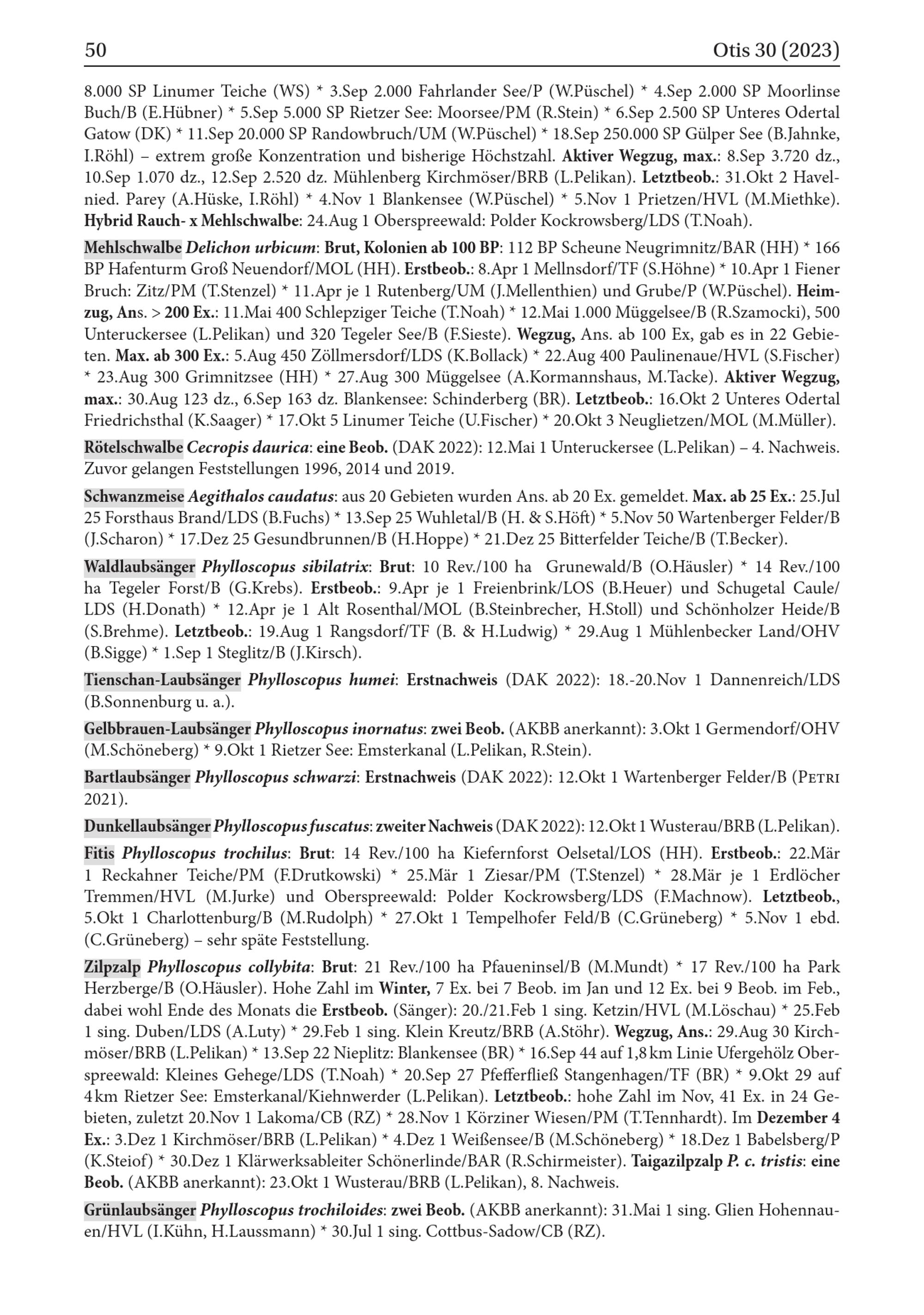 8.000 SP Linumer Teiche( WS)* 3.Sep 2.000 Fahrlander See/ P( W.Püschel)* 4.Sep 2.000 SP Moorlinse Buch/ B( E.Hübner)* 5.Sep 5.000 SP Rietzer See: Moorsee/ PM( R.Stein)* 6.Sep 2.500 SP Unteres Odertal Gatow ( DK)* 11.Sep 20.000 SP Randowbruch/ UM( W.Püschel)* 18.Sep 250.000 SP Gülper See( B.Jahnke, I.Röhl)- extrem große Konzentration und bisherige Höchstzahl. Aktiver Wegzug, max.: 8.Sep 3.720 dz., 10.Sep 1.070 dz., 12.Sep 2.520 dz. Mühlenberg Kirchmöser / BRB ( L.Pelikan). Letztbeob.: 31.Okt 2 Havelnied. Parey( A.Hüske, I.Röhl)* 4.Nov 1 Blankensee( W.Püschel)* 5.Nov 1 Prietzen/ HVL ( M.Miethke). Hybrid Rauch- x Mehlschwalbe: 24.Aug 1 Oberspreewald : Polder Kockrowsberg/ LDS ( T.Noah). Mehlschwalbe Delichon urbicum : Brut, Kolonien ab 100 BP: 112 BP Scheune Neugrimnitz/ BAR( HH )* 166 BP Hafenturm Groß Neuendorf/ MOL( HH ). Erstbeob.: 8.Apr 1 Mellnsdorf/ TF( S.Höhne)* 10.Apr 1 Fiener Bruch: Zitz/ PM( T.Stenzel)* 11.Apr je 1 Rutenberg/ UM( J.Mellenthien) und Grube/ P( W.Püschel). Heimzug, Ans.> 200 Ex.: 11.Mai 400 Schlepziger Teiche( T.Noah)* 12.Mai 1.000 Müggelsee/ B( R.Szamocki), 500 Unteruckersee( L.Pelikan) und 320 Tegeler See/ B( F.Sieste). Wegzug, Ans. ab 100 Ex, gab es in 22 Gebieten. Max. ab 300 Ex.: 5.Aug 450 Zöllmersdorf/ LDS ( K.Bollack)* 22.Aug 400 Paulinenaue / HVL ( S.Fischer ) 23.Aug 300 Grimnitzsee( HH )* 27.Aug 300 Müggelsee( A.Kormannshaus, M.Tacke). Aktiver Wegzug, max.: 30.Aug 123 dz., 6.Sep 163 dz. Blankensee: Schinderberg( BR ). Letztbeob.: 16.Okt 2 Unteres Odertal Friedrichsthal ( K.Saager)* 17.Okt 5 Linumer Teiche( U.Fischer)* 20.Okt 3 Neuglietzen/ MOL( M.Müller). Rötelschwalbe Cecropis daurica: eine Beob.( DAK 2022): 12.Mai 1 Unteruckersee( L.Pelikan)- 4. Nachweis. Zuvor gelangen Feststellungen 1996, 2014 und 2019.