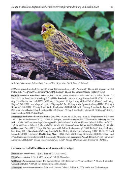 200 Groß Wasserburg/ LDS ( B.Fuchs)* 9.Dez 200 Schmiedeberg / UM( A.Lehnig)* 11.Dez 200 Unteres Odertal Stolpe( DK) 13.Dez 200 Zollbrücke/ MOL( D.Scharlau)* 21.Dez 200 Unteres Odertal Polder 10( DK). Ortolan Emberiza hortulana: Brut: 32 Rev./122 ha Lieper Höhe/ HVL ( MENZEL 2021), hohe Dichte* 18 Rev./18,5 km² Beeskow - Schneeberg/ LOS( HH). Erstbeob.: 20.Apr 2 sing. Zobersdorf/ EE( TS)* 21.Apr 1 sing. Havelländisches Luch/ HVL ( M.Horny, J.Lippert)* 22.Apr 1 sing. Gülpe/ HVL ( S.Klasan) und 2 sing. Ragow/ LOS( HH)* nachfolgend täglich. Wegzug ab 3 Ex.: 12.Aug 3 Alte Spreemündung( HH )* 25.Aug 3 Beeskow / LOS( HH)* 29.Aug 3 nachts dz. Kirchmöser / BRB ( L.Pelikan)* 30.Aug 5 nachts dz. Potsdam / P ( S.Klasan). Letztbeob.: 3.Sep 1 Prützke/ HVL ( S.Klasan)* 7.Sep 2 nachts dz. Potsdam / P( S.Klasan)* 9.Sep 1 Neupetershain / OSL ( A.Günther).