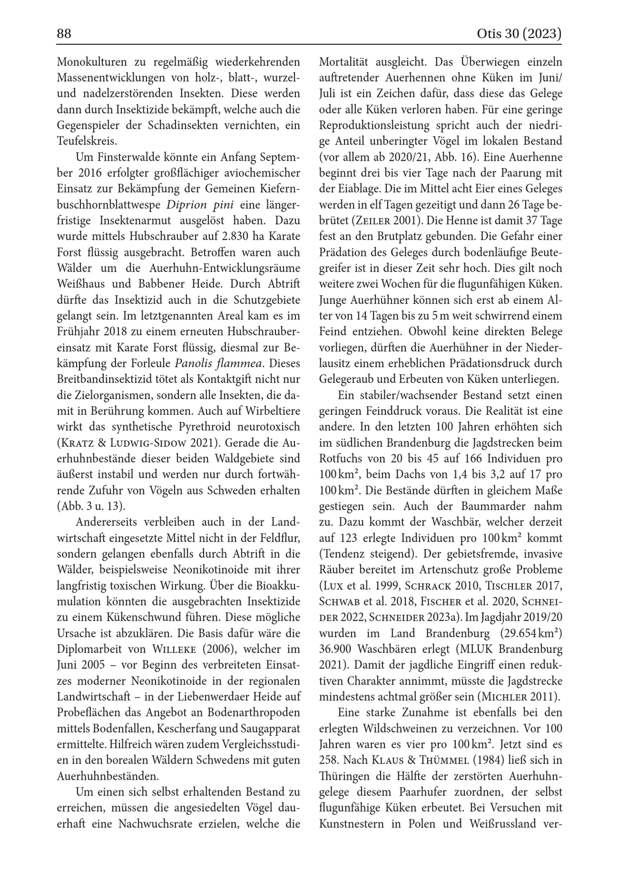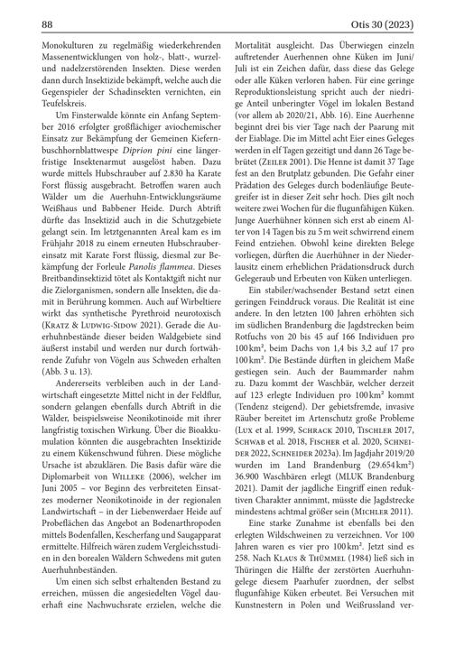 Um Finsterwalde könnte ein Anfang September 2016 erfolgter großflächiger aviochemischer Einsatz zur Bekämpfung der Gemeinen Kiefernbuschhornblattwespe Diprion pini eine längerfristige Insektenarmut ausgelöst haben. Dazu wurde mittels Hubschrauber auf 2.830 ha Karate Forst flüssig ausgebracht. Betroffen waren auch Wälder um die Auerhuhn- Entwicklungsräume Weißhaus und Babbener Heide. Durch Abtrift dürfte das Insektizid auch in die Schutzgebiete gelangt sein. Im letztgenannten Areal kam es im Frühjahr 2018 zu einem erneuten Hubschraubereinsatz mit Karate Forst flüssig, diesmal zur Bekämpfung der Forleule Panolis flammea. Dieses Breitbandinsektizid tötet als Kontaktgift nicht nur die Zielorganismen, sondern alle Insekten, die damit in Berührung kommen. Auch auf Wirbeltiere wirkt das synthetische Pyrethroid neurotoxisch ( KRATZ& LUDWIG- SIDOW 2021). Gerade die Auerhuhnbestände dieser beiden Waldgebiete sind äußerst instabil und werden nur durch fortwährende Zufuhr von Vögeln aus Schweden erhalten ( Abb. 3 u. 13).