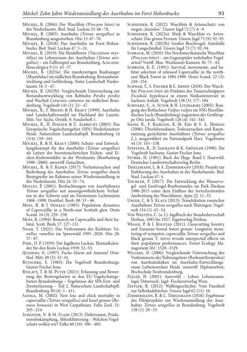 STUBBE, H.( 1981): Buch der Hege. Band I: Haarwild. Deutscher Landwirtschaftsverlag Berlin. THIELEMANN, L.& A. ZIMMERMANN( 2018): Projekt zur Etablierung des Auerhuhns in der Niederlausitz . Biol. Stud. Luckau 47: 4.