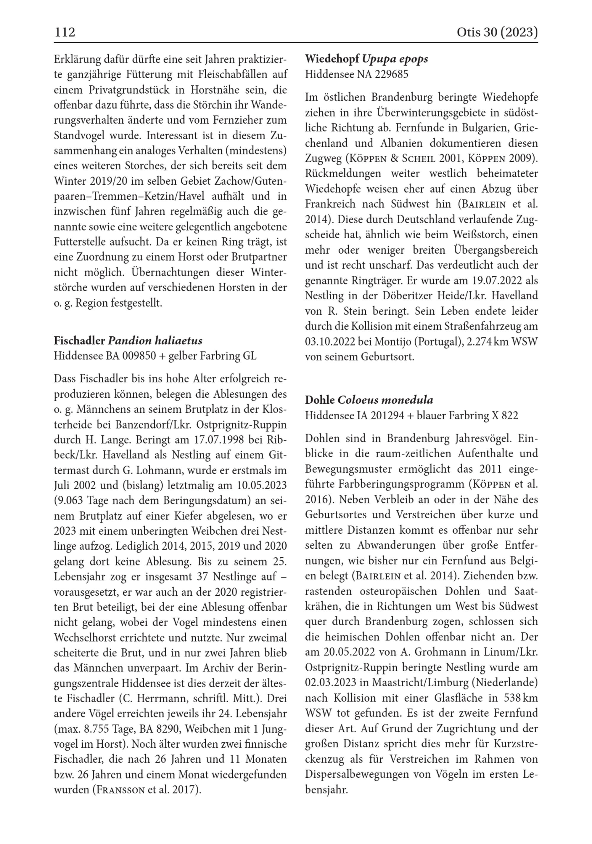 Im östlichen Brandenburg beringte Wiedehopfe ziehen in ihre Überwinterungsgebiete in südöstliche Richtung ab. Fernfunde in Bulgarien , Grie chenland und Albanien dokumentieren diesen Zugweg( KÖPPEN& SCHEIL 2001, KÖPPEN 2009). Rückmeldungen weiter westlich beheimateter Wiedehopfe weisen eher auf einen Abzug über Frankreich nach Südwest hin( BAIRLEIN et al. 2014). Diese durch Deutschland verlaufende Zugscheide hat, ähnlich wie beim Weißstorch, einen mehr oder weniger breiten Übergangsbereich und ist recht unscharf. Das verdeutlicht auch der genannte Ringträger. Er wurde am 19.07.2022 als Nestling in der Döberitzer Heide/ Lkr. Havelland von R. Stein beringt. Sein Leben endete leider durch die Kollision mit einem Straßenfahrzeug am 03.10.2022 bei Montijo( Portugal ), 2.274 km WSW von seinem Geburtsort.