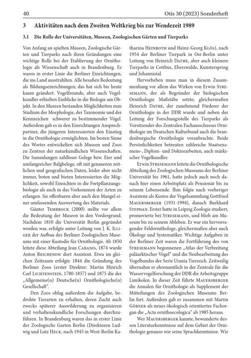 Hervorheben muss man in diesem Zusammenhang vor allem das Wirken von Erwin STRE SEMANN , der als Begründer der biologischen Ornithologie Maßstäbe setzte; gleichermaßen Heinrich DATHE , der zunehmend Förderer der Ornithologie in der DDR wurde und neben der Leitung der Forschungsstelle des Tierparks als Vorsitzender des Zentralen Fachausschusses Ornithologie im Deutschen Kulturbund auch die brandenburgische Ornithologie voranbrachte. Beide Persönlichkeiten betreuten zahlreiche Staatsexamens-, Diplom- und Doktorarbeiten, auch märkischer Vogelkundler.