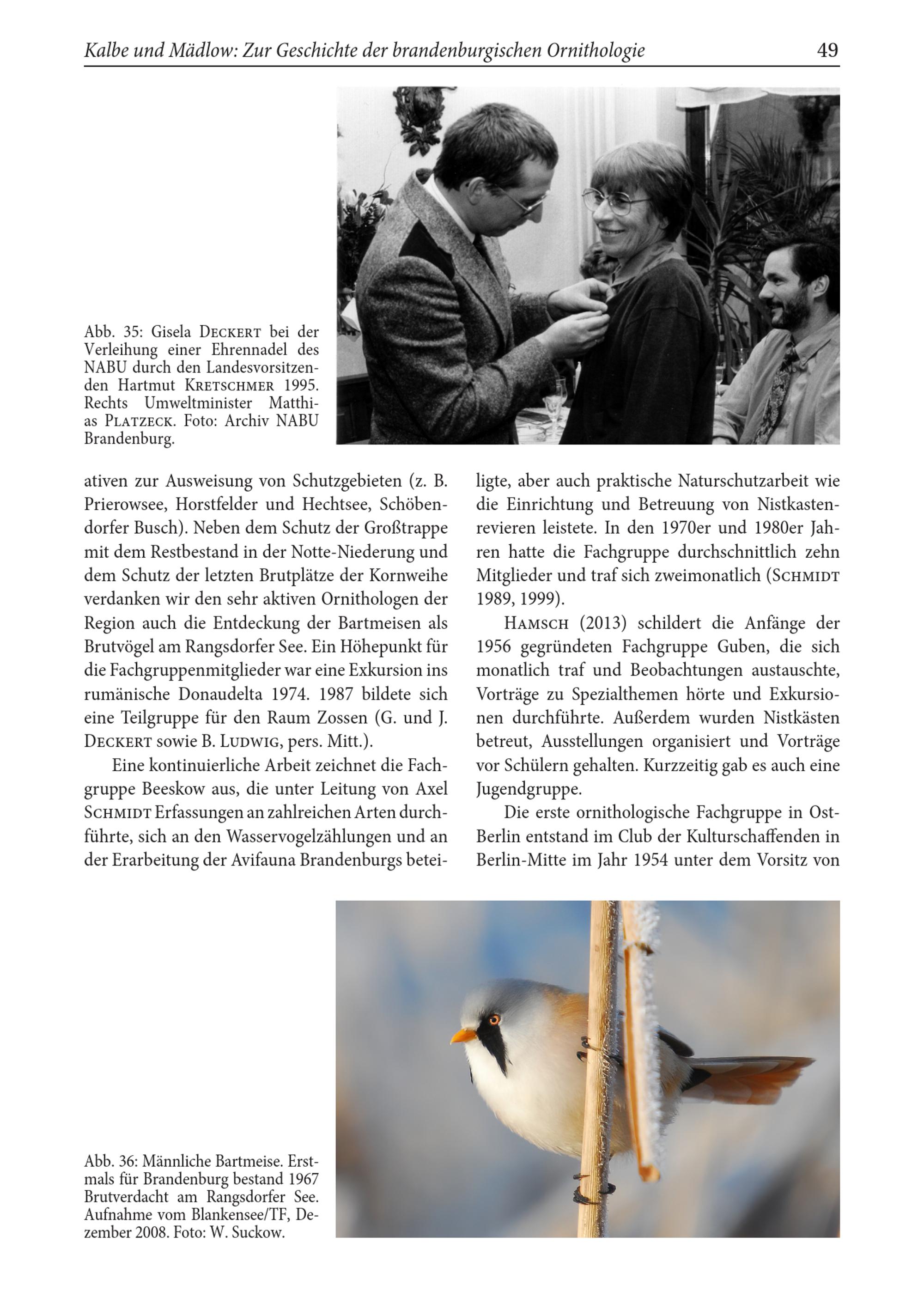 Abb. 35: Gisela DECKERT bei der Verleihung einer Ehrennadel des NABU durch den Landesvorsitzenden Hartmut KRETSCHMER 1995. Rechts Umweltminister Matthi as PLATZECK . Foto: Archiv NABU Brandenburg .