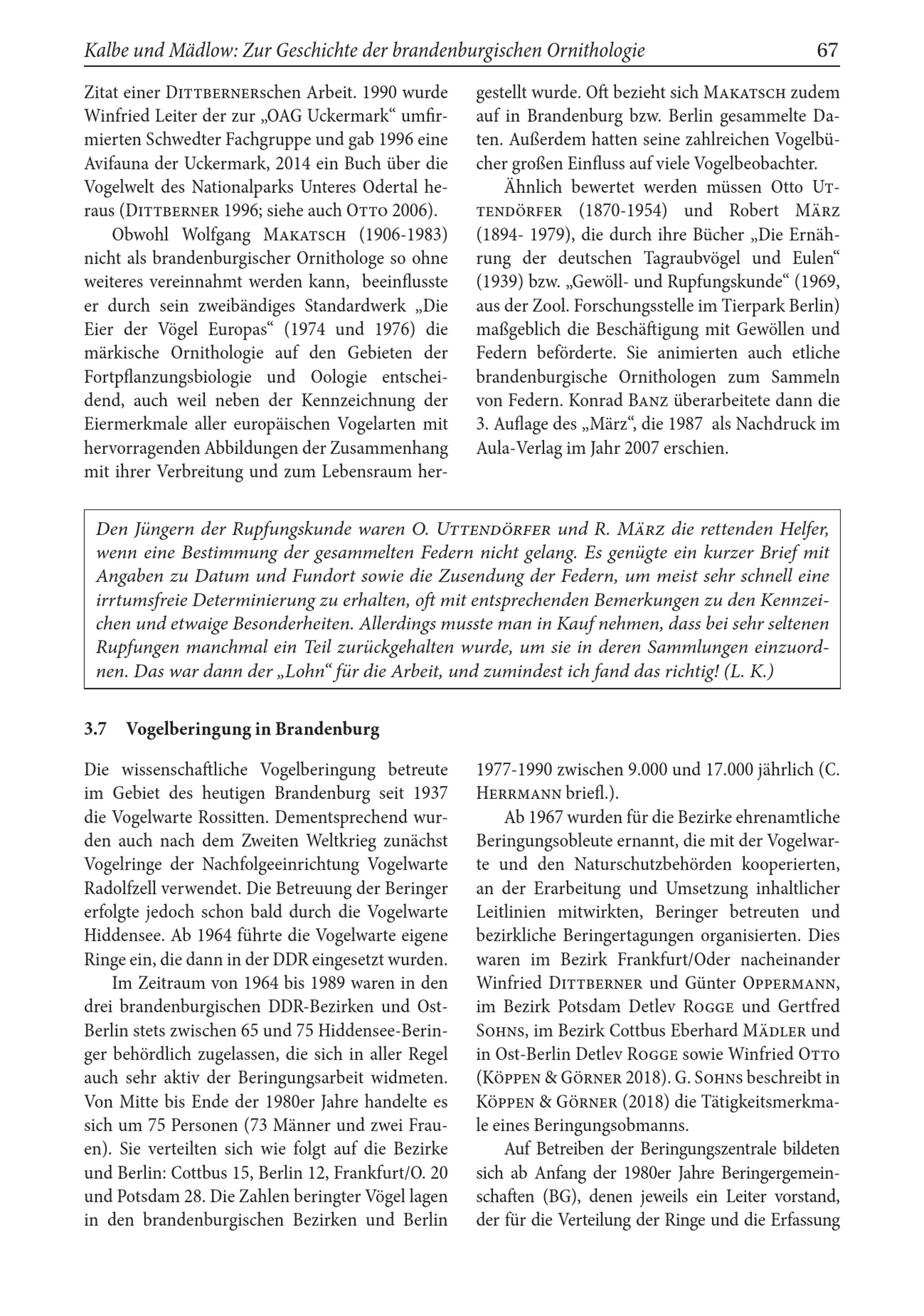 Ähnlich bewertet werden müssen Otto UT TENDÖRFER ( 1870-1954) und Robert MÄRZ ( 1894-1979), die durch ihre Bücher„ Die Ernährung der deutschen Tagraubvögel und Eulen" ( 1939) bzw.„ Gewöll- und Rupfungskunde"( 1969, aus der Zool. Forschungsstelle im Tierpark Berlin ) maßgeblich die Beschäftigung mit Gewöllen und Federn beförderte. Sie animierten auch etliche brandenburgische Ornithologen zum Sammeln von Federn. Konrad BANZ überarbeitete dann die 3. Auflage des„ März", die 1987 als Nachdruck im Aula- Verlag im Jahr 2007 erschien.