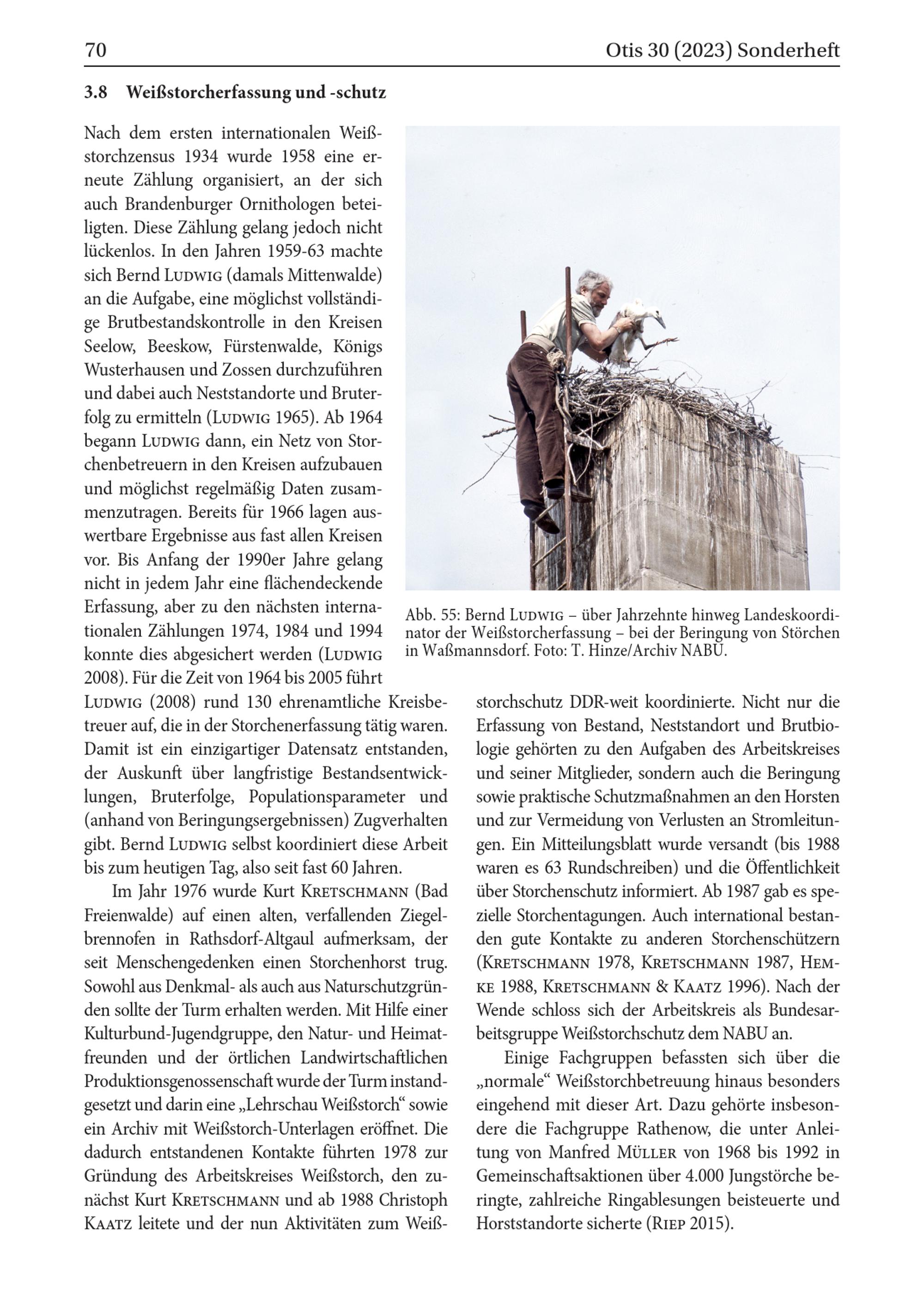Abb. 55: Bernd LUDWIG- über Jahrzehnte hinweg Landeskoordinator der Weiẞstorcherfassung- bei der Beringung von Störchen in Waẞmannsdorf. Foto: T. Hinze/ Archiv NABU .