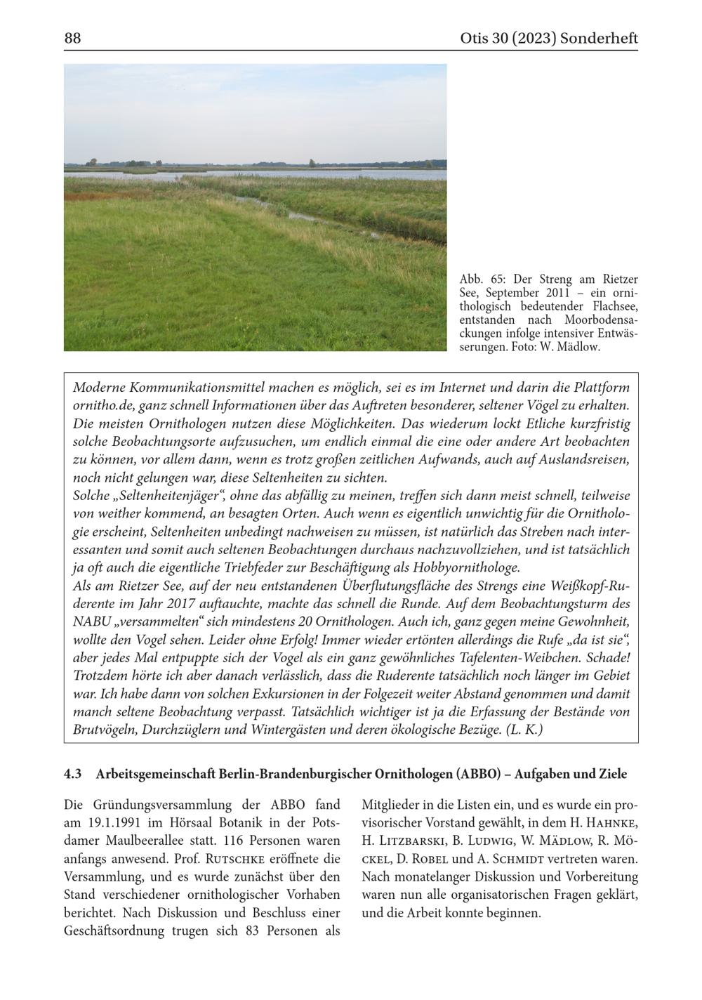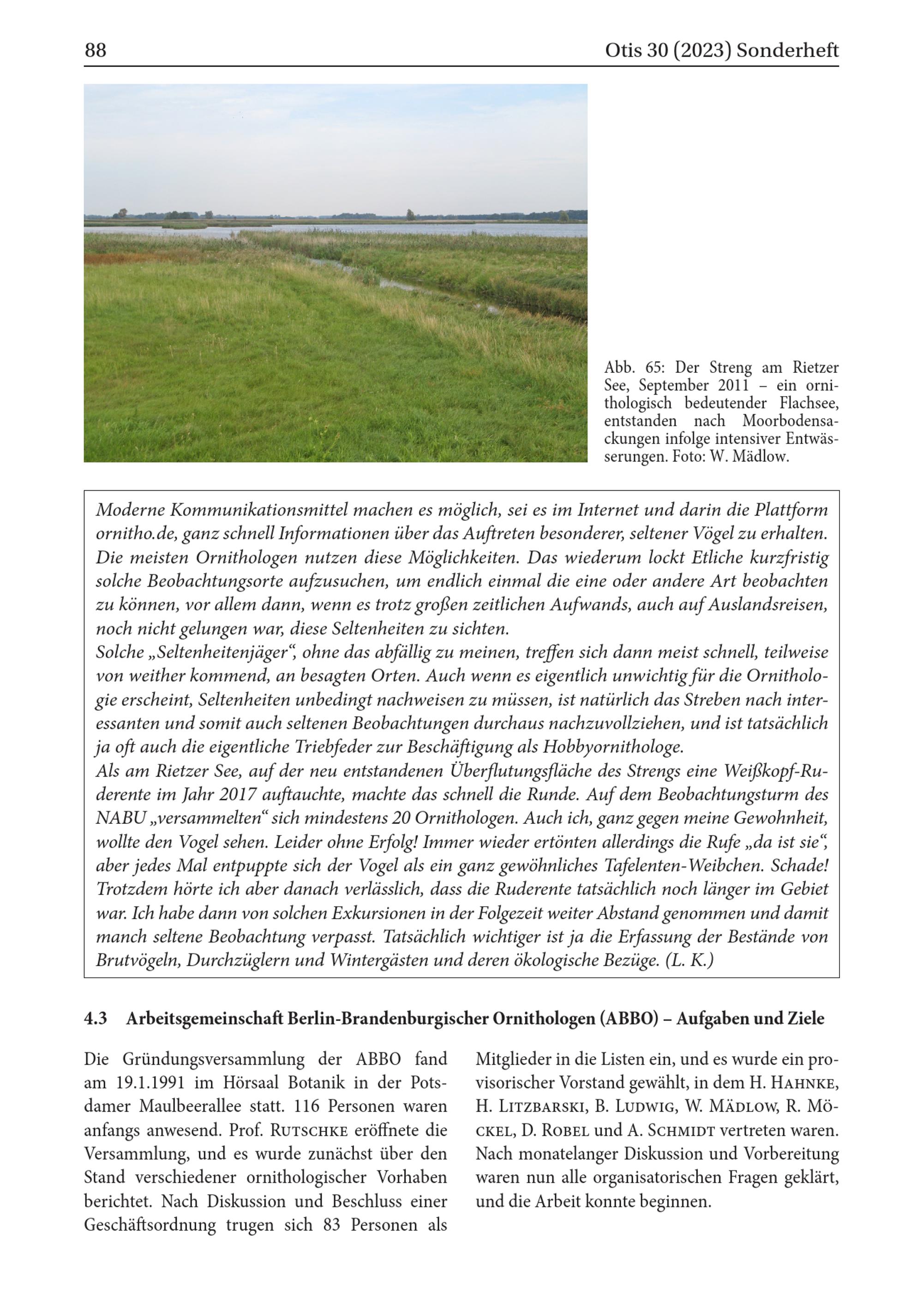 4.3 Arbeitsgemeinschaft Berlin - Brandenburgischer Ornithologen( ABBO)- Aufgaben und Ziele Die Gründungsversammlung der ABBO fand am 19.1.1991 im Hörsaal Botanik in der Pots damer Maulbeerallee statt. 116 Personen waren anfangs anwesend. Prof. RUTSCHKE eröffnete die Versammlung, und es wurde zunächst über den Stand verschiedener ornithologischer Vorhaben berichtet. Nach Diskussion und Beschluss einer Geschäftsordnung trugen sich 83 Personen als