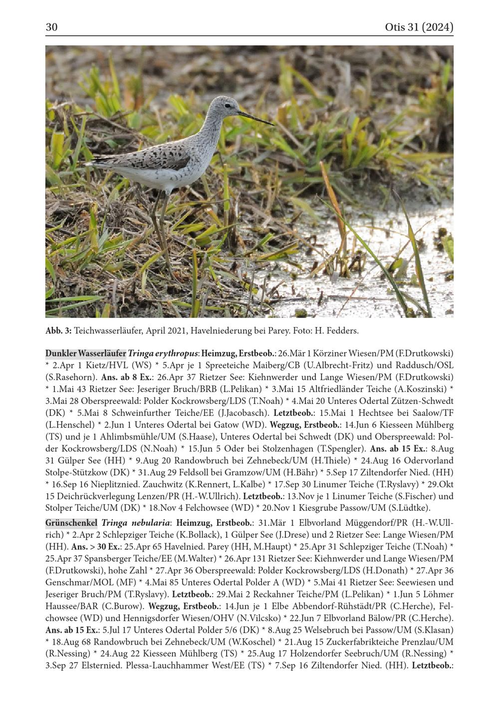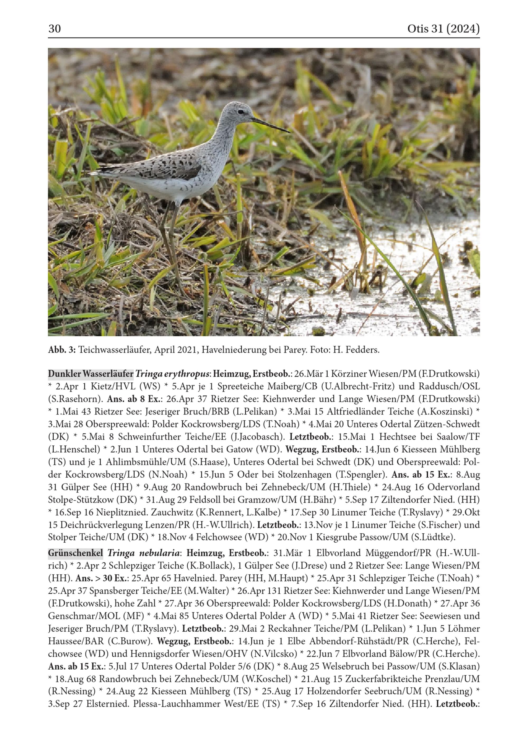 Dunkler Wasserläufer Tringa erythropus: Heimzug, Erstbeob.: 26. Mär 1 Körziner Wiesen/ PM( F.Drutkowski) 2.Apr 1 Kietz/ HVL ( WS)* 5.Apr je 1 Spreeteiche Maiberg/ CB( U.Albrecht- Fritz) und Raddusch / OSL ( S.Rasehorn). Ans. ab 8 Ex.: 26.Apr 37 Rietzer See: Kiehnwerder und Lange Wiesen/ PM( F.Drutkowski) * 1.Mai 43 Rietzer See: Jeseriger Bruch/ BRB ( L.Pelikan)* 3.Mai 15 Altfriedländer Teiche( A.Koszinski) 3.Mai 28 Oberspreewald : Polder Kockrowsberg/ LDS ( T.Noah)* 4.Mai 20 Unteres Odertal Zützen- Schwedt ( DK) 5.Mai 8 Schweinfurther Teiche/ EE( J.Jacobasch). Letztbeob.: 15.Mai 1 Hechtsee bei Saalow/ TF ( L.Henschel)* 2.Jun 1 Unteres Odertal bei Gatow( WD). Wegzug, Erstbeob.: 14.Jun 6 Kiesseen Mühlberg ( TS) und je 1 Ahlimbsmühle/ UM( S.Haase), Unteres Odertal bei Schwedt ( DK) und Oberspreewald : Polder Kockrowsberg/ LDS ( N.Noah)* 15.Jun 5 Oder bei Stolzenhagen( T.Spengler). Ans. ab 15 Ex.: 8.Aug 31 Gülper See( HH )* 9.Aug 20 Randowbruch bei Zehnebeck/ UM( H.Thiele)* 24.Aug 16 Odervorland Stolpe- Stützkow( DK)* 31.Aug 29 Feldsoll bei Gramzow / UM( H.Bähr)* 5.Sep 17 Ziltendorfer Nied. ( HH ) * 16.Sep 16 Nieplitznied. Zauchwitz ( K.Rennert, L.Kalbe)* 17.Sep 30 Linumer Teiche( T.Ryslavy)* 29.Okt 15 Deichrückverlegung Lenzen/ PR( H.- W.Ullrich). Letztbeob.: 13.Nov je 1 Linumer Teiche( S.Fischer ) und Stolper Teiche/ UM( DK)* 18.Nov 4 Felchowsee( WD)* 20.Nov 1 Kiesgrube Passow/ UM( S.Lüdtke). Grünschenkel Tringa nebularia: Heimzug, Erstbeob.: 31.Mär 1 Elbvorland Müggendorf/ PR( H.- W.Ullrich)* 2.Apr 2 Schlepziger Teiche( K.Bollack), 1 Gülper See( J.Drese) und 2 Rietzer See: Lange Wiesen/ PM ( HH ). Ans.> 30 Ex.: 25.Apr 65 Havelnied. Parey ( HH , M.Haupt)* 25.Apr 31 Schlepziger Teiche( T.Noah)* 25.Apr 37 Spansberger Teiche/ EE( M.Walter)* 26.Apr 131 Rietzer See: Kiehnwerder und Lange Wiesen/ PM ( F.Drutkowski), hohe Zahl* 27.Apr 36 Oberspreewald : Polder Kockrowsberg/ LDS ( H.Donath)* 27.Apr 36 Genschmar/ MOL( MF)* 4.Mai 85 Unteres Odertal Polder A( WD)* 5.Mai 41 Rietzer See: Seewiesen und Jeseriger Bruch/ PM( T.Ryslavy). Letztbeob.: 29.Mai 2 Reckahner Teiche/ PM( L.Pelikan)* 1.Jun 5 Löhmer Haussee/ BAR( C.Burow). Wegzug, Erstbeob.: 14.Jun je 1 Elbe Abbendorf- Rühstädt/ PR( C.Herche), Felchowsee( WD) und Hennigsdorfer Wiesen/ OHV ( N.Vilcsko)* 22.Jun 7 Elbvorland Bälow/ PR( C.Herche). Ans. ab 15 Ex.: 5.Jul 17 Unteres Odertal Polder 5/6( DK)* 8.Aug 25 Welsebruch bei Passow / UM( S.Klasan) * 18.Aug 68 Randowbruch bei Zehnebeck/ UM( W.Koschel)* 21.Aug 15 Zuckerfabrikteiche Prenzlau / UM ( R.Nessing)* 24.Aug 22 Kiesseen Mühlberg( TS)* 25.Aug 17 Holzendorfer Seebruch/ UM( R.Nessing) › 3.Sep 27 Elsternied. Plessa- Lauchhammer West/ EE( TS)* 7.Sep 16 Ziltendorfer Nied. ( HH ). Letztbeob.: