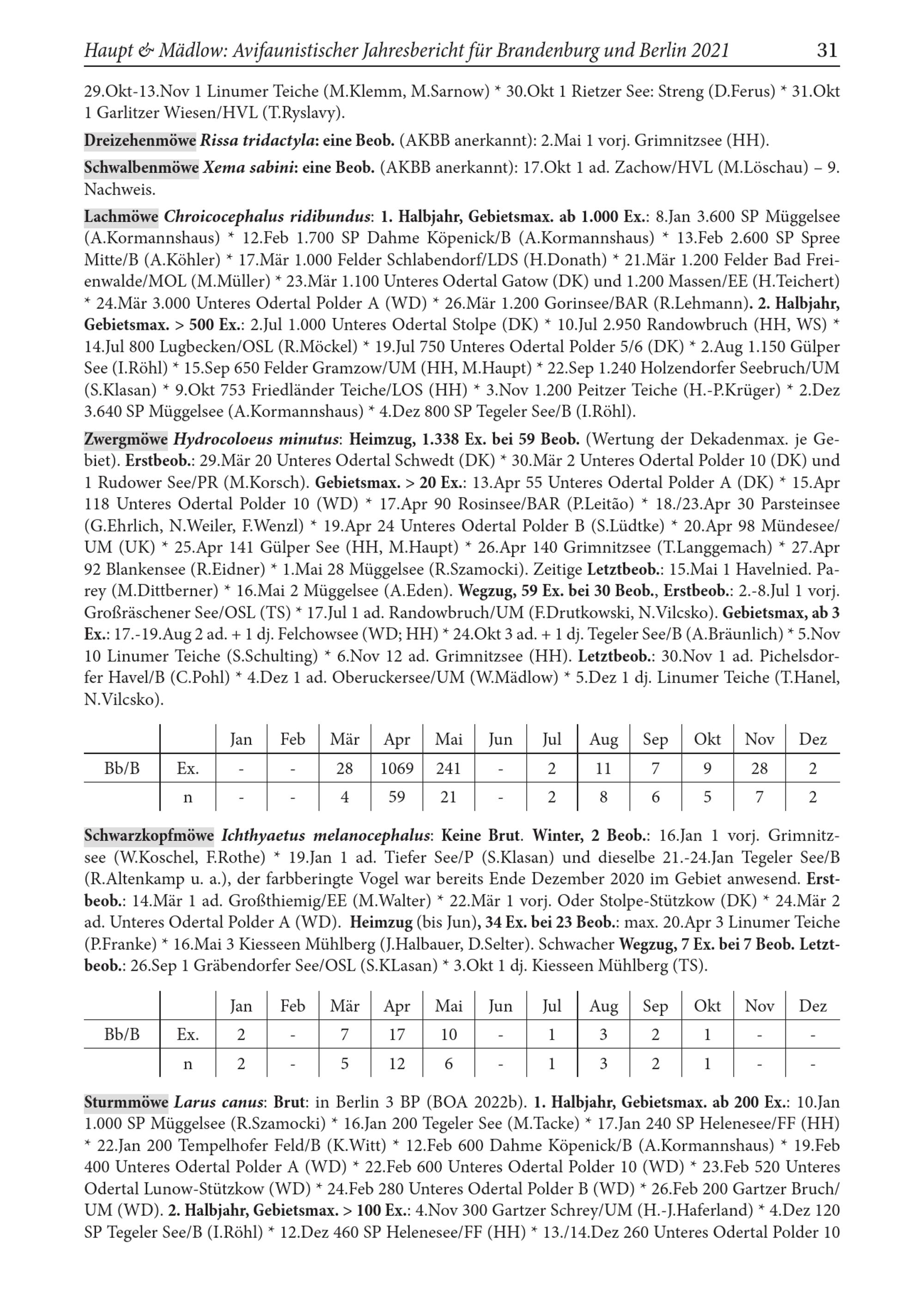 Schwarzkopfmöwe Ichthyaetus melanocephalus: Keine Brut. Winter, 2 Beob.: 16.Jan 1 vorj. Grimnitz­see( W.Koschel, F.Rothe)* 19.Jan 1 ad. Tiefer See/ P( S.Klasan) und dieselbe 21.- 24. Jan Tegeler See/ B ( R.Altenkamp u. a.), der farbberingte Vogel war bereits Ende Dezember 2020 im Gebiet anwesend. Erst­beob.: 14.Mär 1 ad. Großthiemig / EE( M.Walter)* 22.Mär 1 vorj. Oder Stolpe- Stützkow( DK)* 24.Mär 2 ad. Unteres Odertal Polder A( WD). Heimzug( bis Jun), 34 Ex. bei 23 Beob.: max. 20.Apr 3 Linumer Teiche ( P.Franke) 16.Mai 3 Kiesseen Mühlberg( J.Halbauer, D.Selter). Schwacher Wegzug, 7 Ex. bei 7 Beob. Letzt­beob.: 26.Sep 1 Gräbendorfer See/ OSL ( S.KLasan)* 3.Okt 1 dj. Kiesseen Mühlberg ( TS).