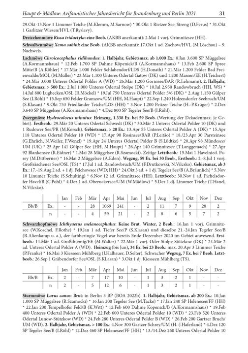 Zwergmöwe Hydrocoloeus minutus: Heimzug, 1.338 Ex. bei 59 Beob.( Wertung der Dekadenmax. je Ge­biet). Erstbeob.: 29. Mär 20 Unteres Odertal Schwedt ( DK)* 30. Mär 2 Unteres Odertal Polder 10( DK) und 1 Rudower See/ PR( M.Korsch). Gebietsmax.> 20 Ex.: 13.Apr 55 Unteres Odertal Polder A( DK)* 15.Apr 118 Unteres Odertal Polder 10( WD)* 17.Apr 90 Rosinsee/ BAR( P.Leitão)* 18./23.Apr 30 Parsteinsee ( G.Ehrlich, N.Weiler, F.Wenzl)* 19.Apr 24 Unteres Odertal Polder B( S.Lüdtke)* 20.Apr 98 Mündesee/ UM( UK ) 25.Apr 141 Gülper See( HH , M.Haupt)* 26.Apr 140 Grimnitzsee( T.Langgemach)* 27.Apr 92 Blankensee ( R.Eidner)* 1.Mai 28 Müggelsee( R.Szamocki). Zeitige Letztbeob.: 15.Mai 1 Havelnied. Pa­ rey ( M.Dittberner)* 16.Mai 2 Müggelsee( A.Eden). Wegzug, 59 Ex. bei 30 Beob., Erstbeob.: 2.- 8.Jul 1 vorj. Großräschener See/ OSL ( TS)* 17.Jul 1 ad. Randowbruch/ UM( F.Drutkowski, N.Vilcsko). Gebietsmax, ab 3 Ex.: 17.- 19.Aug 2 ad.+ 1 dj. Felchowsee( WD; HH )* 24.Okt 3 ad.+ 1 dj. Tegeler See/ B( A.Bräunlich)* 5.Nov 10 Linumer Teiche( S.Schulting)* 6.Nov 12 ad. Grimnitzsee( HH ). Letztbeob.: 30.Nov 1 ad. Pichelsdor­fer Havel / B( C.Pohl)* 4.Dez 1 ad. Oberuckersee/ UM( W.Mädlow)* 5.Dez 1 dj. Linumer Teiche( T.Hanel, N.Vilcsko).