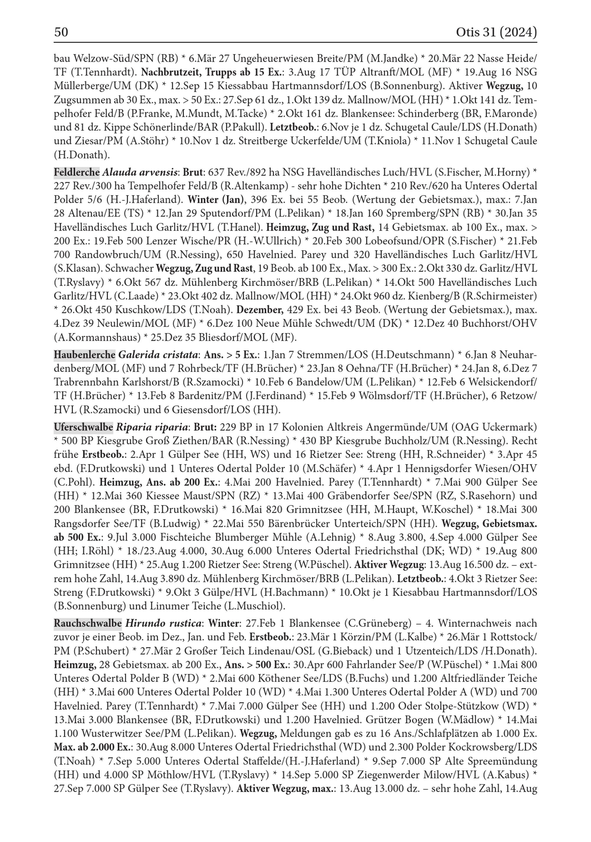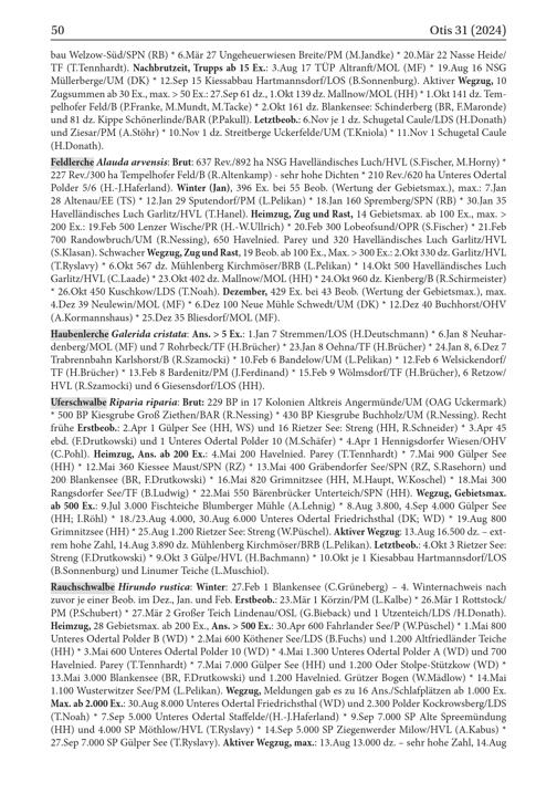 Feldlerche Alauda arvensis : Brut: 637 Rev./892 ha NSG Havelländisches Luch/ HVL ( S.Fischer, M.Horny)* 227 Rev./300 ha Tempelhofer Feld/ B( R.Altenkamp)- sehr hohe Dichten* 210 Rev./620 ha Unteres Odertal Polder 5/6( H.- J.Haferland). Winter( Jan), 396 Ex. bei 55 Beob.( Wertung der Gebietsmax.), max.: 7.Jan 28 Altenau/ EE( TS)* 12.Jan 29 Sputendorf/ PM( L.Pelikan)* 18.Jan 160 Spremberg/ SPN ( RB)* 30.Jan 35 Havelländisches Luch Garlitz/ HVL ( T.Hanel). Heimzug, Zug und Rast, 14 Gebietsmax. ab 100 Ex., max.> 200 Ex.: 19.Feb 500 Lenzer Wische / PR( H.- W.Ullrich)* 20.Feb 300 Lobeofsund/ OPR ( S.Fischer)* 21. Feb 700 Randowbruch/ UM( R.Nessing), 650 Havelnied. Parey und 320 Havelländisches Luch Garlitz / HVL ( S.Klasan). Schwacher Wegzug, Zug und Rast, 19 Beob. ab 100 Ex., Max.> 300 Ex.: 2.Okt 330 dz. Garlitz / HVL ( T.Ryslavy)* 6.Okt 567 dz. Mühlenberg Kirchmöser/ BRB ( L.Pelikan)* 14.Okt 500 Havelländisches Luch Garlitz / HVL ( C.Laade)* 23.Okt 402 dz. Mallnow/ MOL( HH )* 24.Okt 960 dz. Kienberg/ B( R.Schirmeister) * 26.Okt 450 Kuschkow/ LDS ( T.Noah). Dezember, 429 Ex. bei 43 Beob.( Wertung der Gebietsmax.), max. 4.Dez 39 Neulewin / MOL( MF)* 6.Dez 100 Neue Mühle Schwedt / UM( DK)* 12.Dez 40 Buchhorst / OHV ( A.Kormannshaus)* 25.Dez 35 Bliesdorf / MOL( MF).
