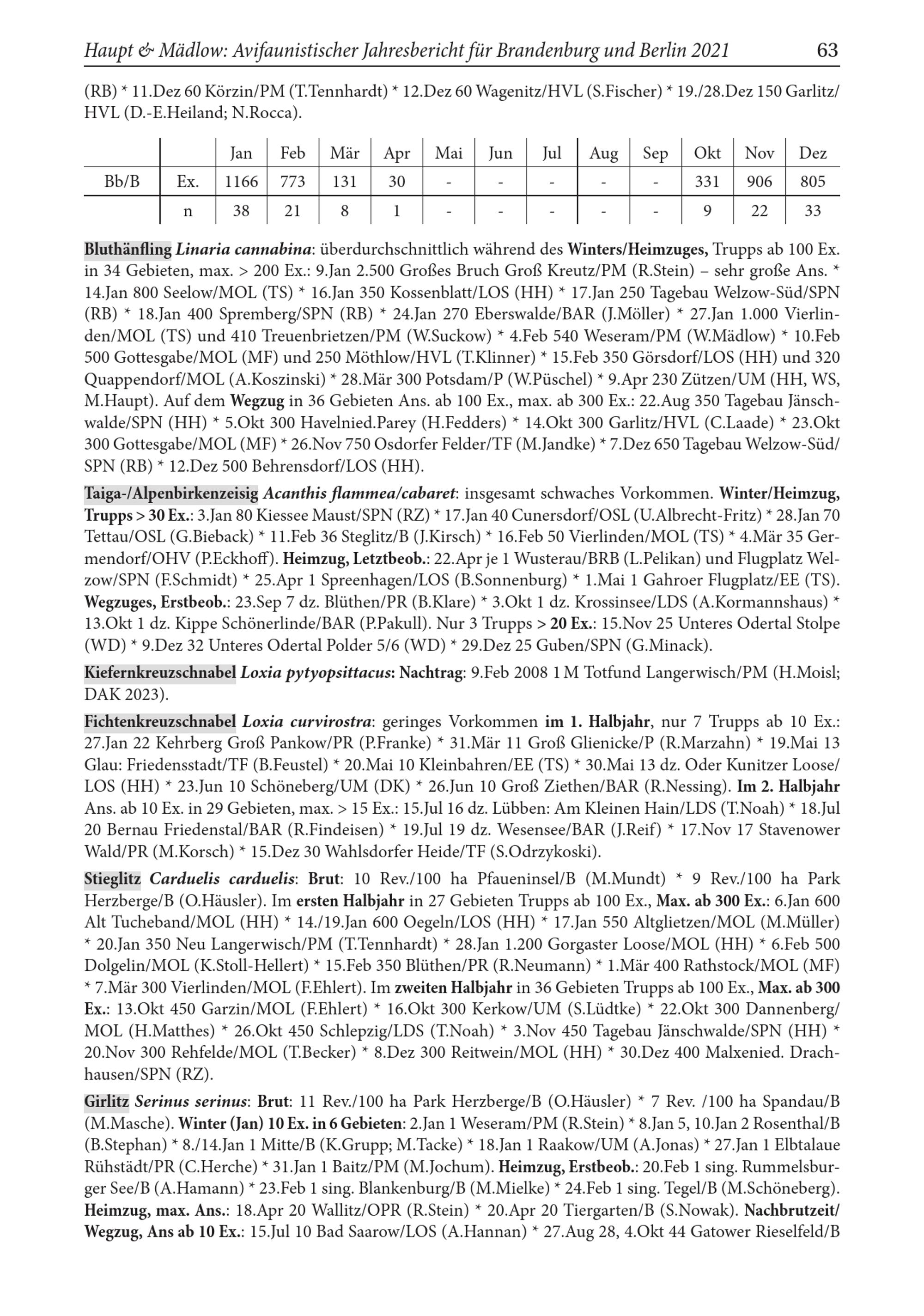Bluthänfling Linaria cannabina: überdurchschnittlich während des Winters/ Heimzuges, Trupps ab 100 Ex. in 34 Gebieten, max.> 200 Ex.: 9.Jan 2.500 Großes Bruch Groß Kreutz / PM( R.Stein)- sehr große Ans.* 14.Jan 800 Seelow/ MOL( TS)* 16.Jan 350 Kossenblatt/ LOS( HH)* 17.Jan 250 Tagebau Welzow- Süd/ SPN ( RB)* 18.Jan 400 Spremberg/ SPN ( RB)* 24.Jan 270 Eberswalde/ BAR( J.Möller)* 27.Jan 1.000 Vierlin­den/ MOL( TS) und 410 Treuenbrietzen / PM( W.Suckow)* 4.Feb 540 Weseram/ PM( W.Mädlow)* 10.Feb 500 Gottesgabe/ MOL ( MF) und 250 Möthlow/ HVL ( T.Klinner)* 15.Feb 350 Görsdorf/ LOS( HH) und 320 Quappendorf/ MOL( A.Koszinski)* 28. Mär 300 Potsdam/ P( W.Püschel)* 9.Apr 230 Zützen/ UM( HH , WS, M.Haupt). Auf dem Wegzug in 36 Gebieten Ans. ab 100 Ex., max. ab 300 Ex.: 22.Aug 350 Tagebau Jänsch­walde/ SPN ( HH )* 5.Okt 300 Havelnied. Parey ( H.Fedders)* 14.Okt 300 Garlitz / HVL ( C.Laade)* 23.Okt 300 Gottesgabe/ MOL( MF)* 26. Nov 750 Osdorfer Felder/ TF( M.Jandke)* 7.Dez 650 Tagebau Welzow- Süd/ SPN ( RB)* 12.Dez 500 Behrensdorf/ LOS( HH ).