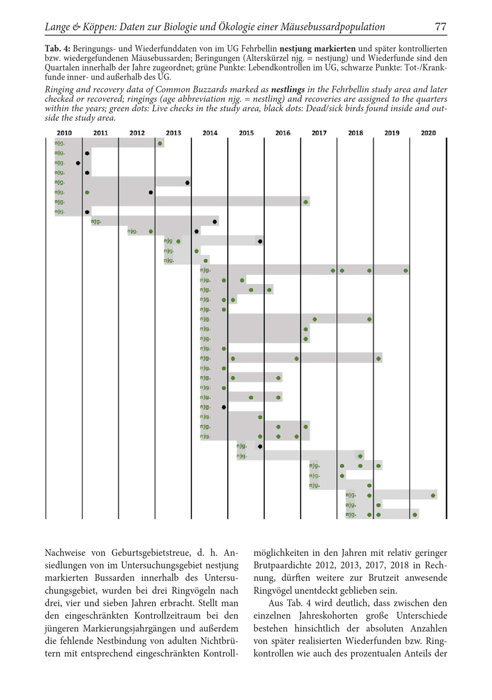 Ringing and recovery data of Common Buzzards marked as nestlings in the Fehrbellin study area and later checked or recovered; ringings( age abbreviation njg.= nestling) and recoveries are assigned to the quarters within the years; green dots: Live checks in the study area, black dots: Dead/ sick birds found inside and outside the study area.