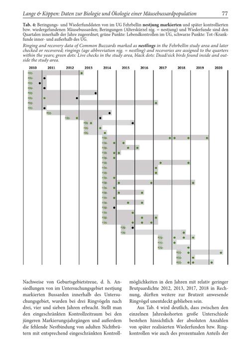möglichkeiten in den Jahren mit relativ geringer Brutpaardichte 2012, 2013, 2017, 2018 in Rechnung, dürften weitere zur Brutzeit anwesende Ringvögel unentdeckt geblieben sein.
