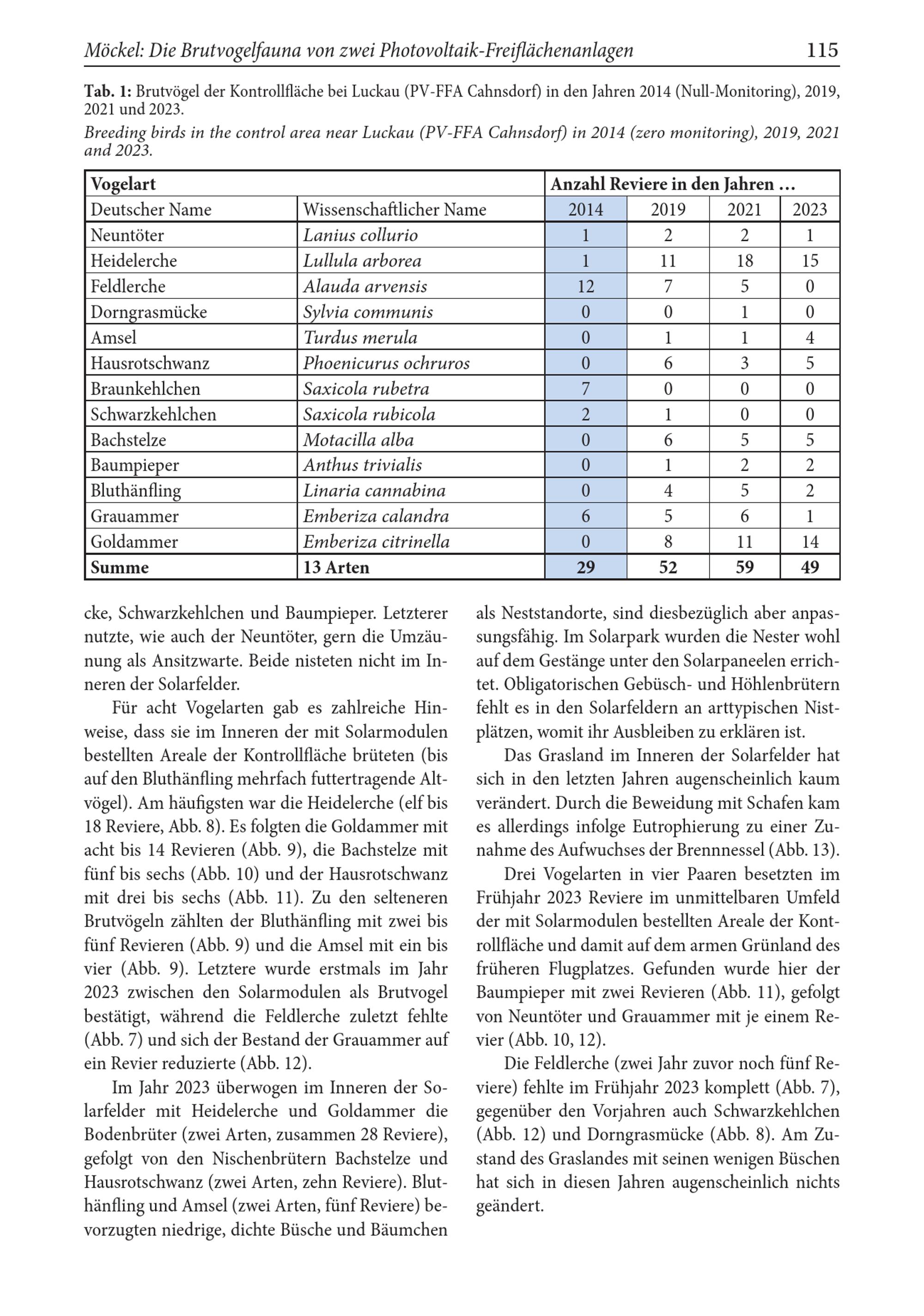 als Neststandorte, sind diesbezüglich aber sungsfähig. Im Solarpark wurden die Nester wohl auf dem Gestänge unter den Solarpaneelen errichtet. Obligatorischen Gebüsch- und Höhlenbrütern fehlt es in den Solarfeldern an arttypischen Nistplätzen, womit ihr Ausbleiben zu erklären ist.