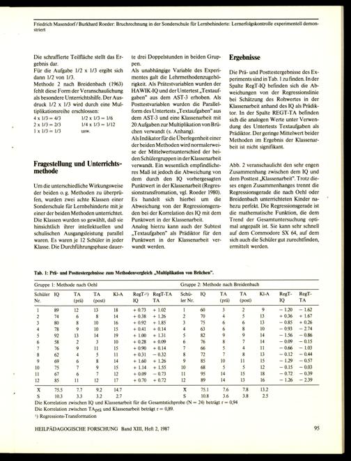 Als Indikator für die Überlegenheit einer der beiden Methoden wird normalerweise der Mittelwertsunterschied der beiden Schülergruppen in der Klassenarbeit verwandt. Ein wesentlich empfindlicheres Maß ist jedoch die Abweichung von dem durch den IQ vorhergesagten Punktwert in der Klassenarbeit(Regressionstransfromation, vgl. Roeder 1980). Es handelt sich hierbei um die Abweichung von der Regressionsgeraden bei der Korrelation des IQ mit dem Punktwert in der Klassenarbeit. Analog hierzu kann auch der Subtest „Textaufgaben” als Prädiktor für den Punktwert in der Klassenarbeit verwandt werden.
