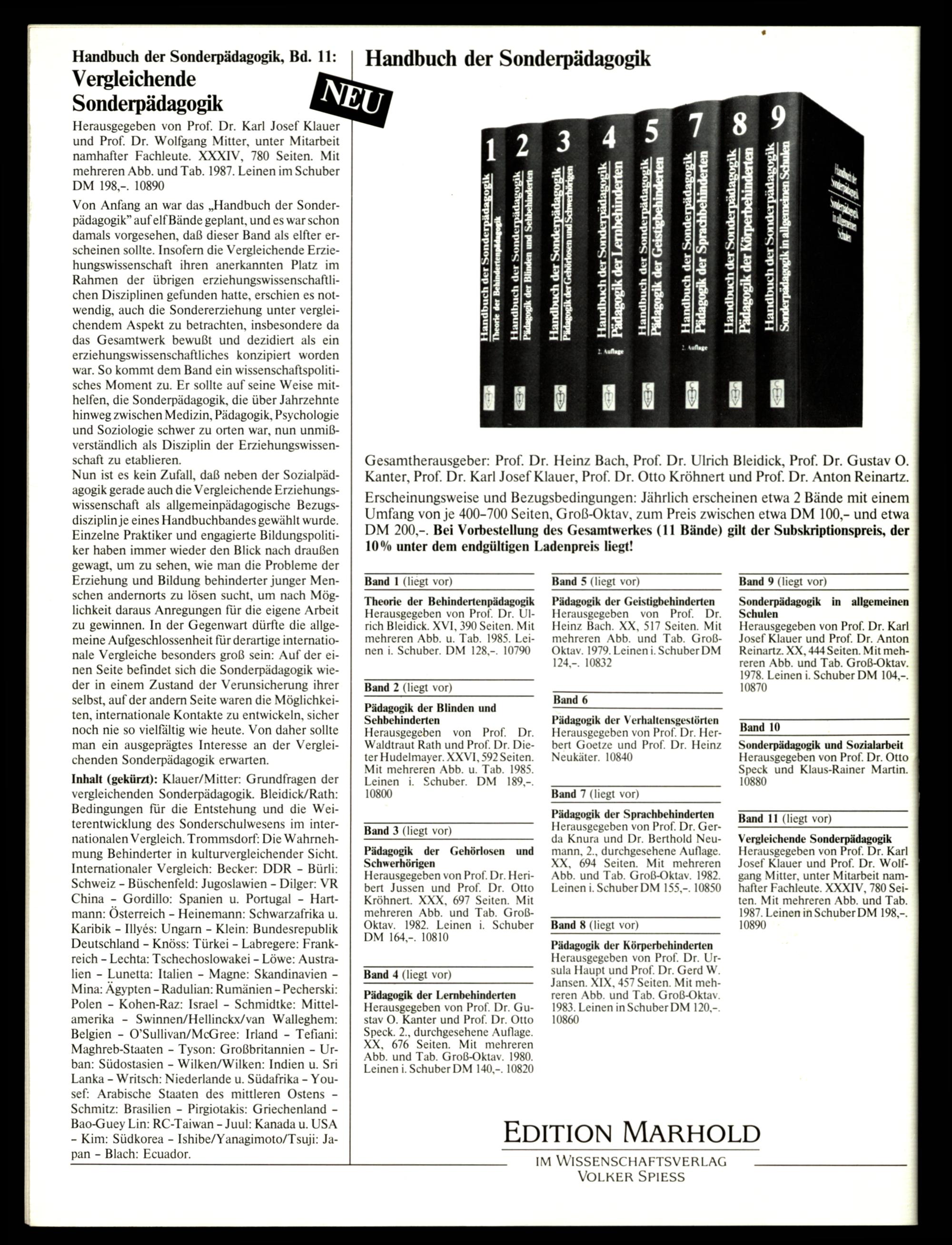 Inhalt(gekürzt): Klauer/Mitter: Grundfragen der vergleichenden Sonderpädagogik. Bleidick/Rath: Bedingungen für die Entstehung und die Weiterentwicklung des Sonderschulwesens im internationalen Vergleich. Trommsdorf: Die Wahrnehmung Behinderter in kulturvergleichender Sicht. Internationaler Vergleich: Becker: DDR- Bürli: Schweiz- Büschenfeld: Jugoslawien- Dilger: VR China- Gordillo: Spanien u. Portugal- Hartmann: Österreich- Heinemann: Schwarzafrika u. Karibik- Illyes: Ungarn- Klein: Bundesrepublik Deutschland- Knöss: Türkei- Labregere: Frankreich- Lechta: Tschechoslowakei- Löwe: Australien- Lunetta: Italien- Magne: Skandinavien Mina: Agypten- Radulian: Rumänien- Pecherski: Polen- Kohen-Raz: Israel- Schmidtke: Mittelamerika- Swinnen/Hellinckx/van Walleghem: Belgien- O’Sullivan/McGree: Irland- Tefiani: Maghreb-Staaten- Tyson: Großbritannien- Urban: Südostasien- Wilken/Wilken: Indien u. Sri Lanka- Writsch: Niederlande u. Südafrika- Yousef: Arabische Staaten des mittleren Ostens Schmitz: Brasilien- Pirgiotakis: Griechenland Bao-Guey Lin: RC-Taiwan- Juul: Kanada u. USA - Kim: Südkorea- Ishibe/Yanagimoto/Tsuji: Japan- Blach: Ecuador.