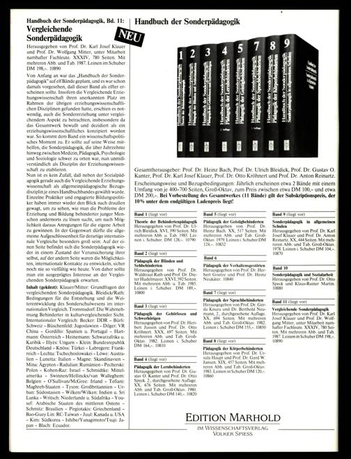 Vergleichende Sonderpädagogik Herausgegeben von Prof. Dr. Karl Josef Klauer und Prof. Dr. Wolfgang Mitter, unter Mitarbeit namhafter Fachleute. XXXIV, 780 Seiten. Mit mehreren Abb. und Tab. 1987. Leinen in Schuber DM 198,-. 10890