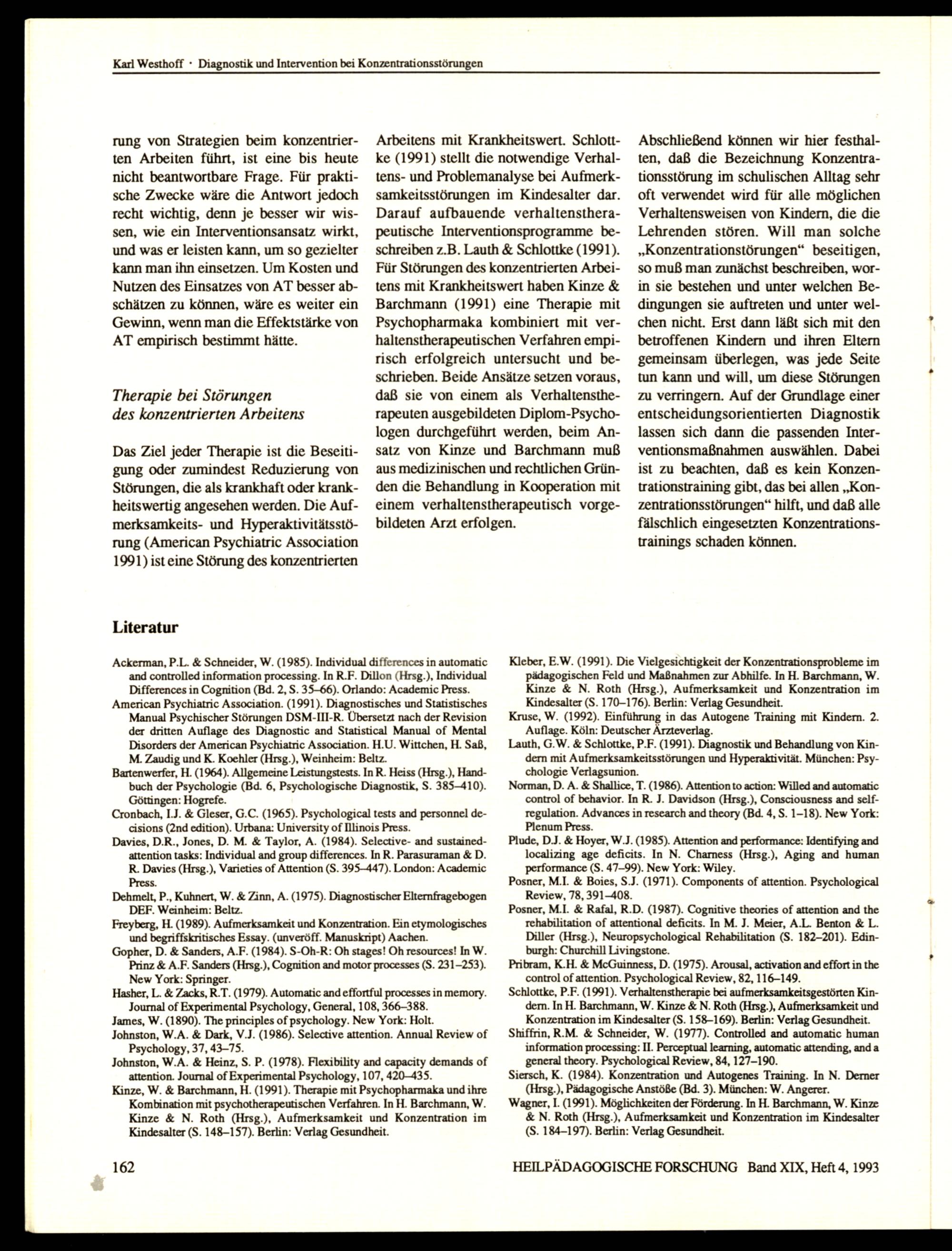 Arbeitens mit Krankheitswert. Schlottke(1991) stellt die notwendige Verhaltens- und Problemanalyse bei Aufmerksamkeitsstörungen im Kindesalter dar. Darauf aufbauende verhaltenstherapeutische Interventionsprogramme beschreiben z.B. Lauth& Schlottke(1991). Für Störungen des konzentrierten Arbeitens mit Krankheitswert haben Kinze& Barchmann(1991) eine Therapie mit Psychopharmaka kombiniert mit verhaltenstherapeutischen Verfahren empirisch erfolgreich untersucht und beschrieben. Beide Ansätze setzen voraus, daß sie von einem als Verhaltenstherapeuten ausgebildeten Diplom-Psychologen durchgeführt werden, beim Ansatz von Kinze und Barchmann muß aus medizinischen und rechtlichen Gründen die Behandlung in Kooperation mit einem verhaltenstherapeutisch vorgebildeten Arzt erfolgen.